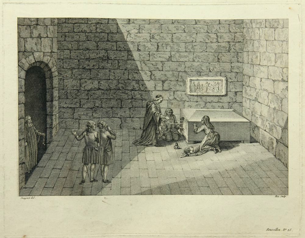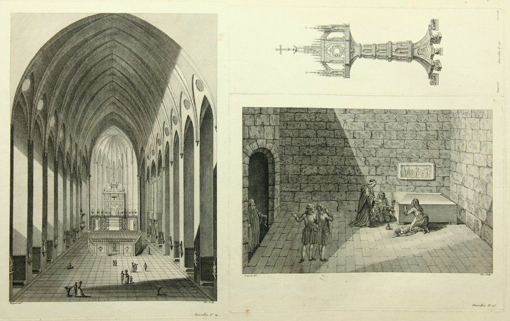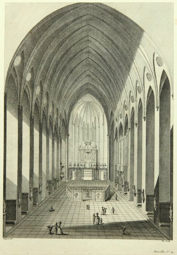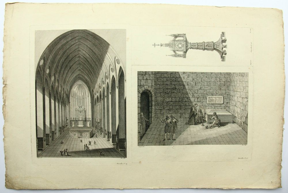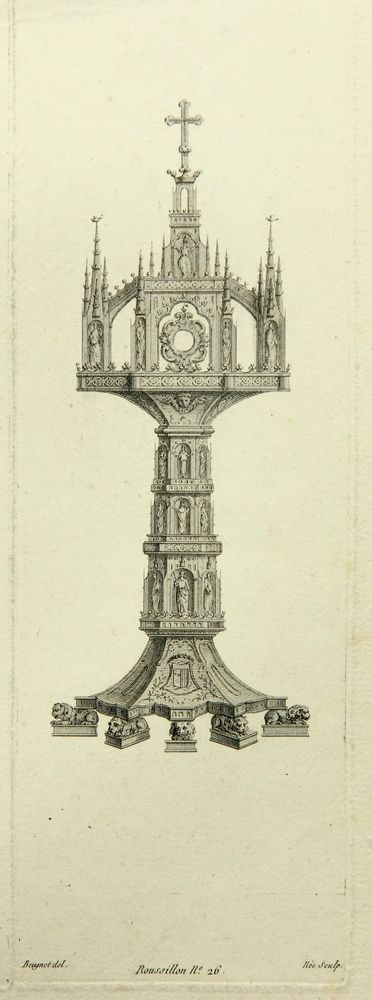 François Denis Née (um 1739 Paris – um 1817 ebd.) nach Jean Beugnet (unb. -1803 ), Kathedrale in Perpignan und gotische Monstranz, 18. Jahrhundert, Kupferstich