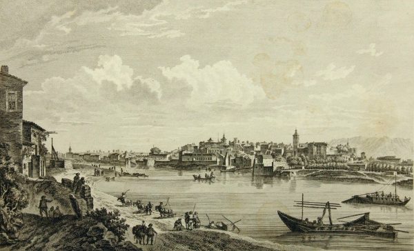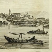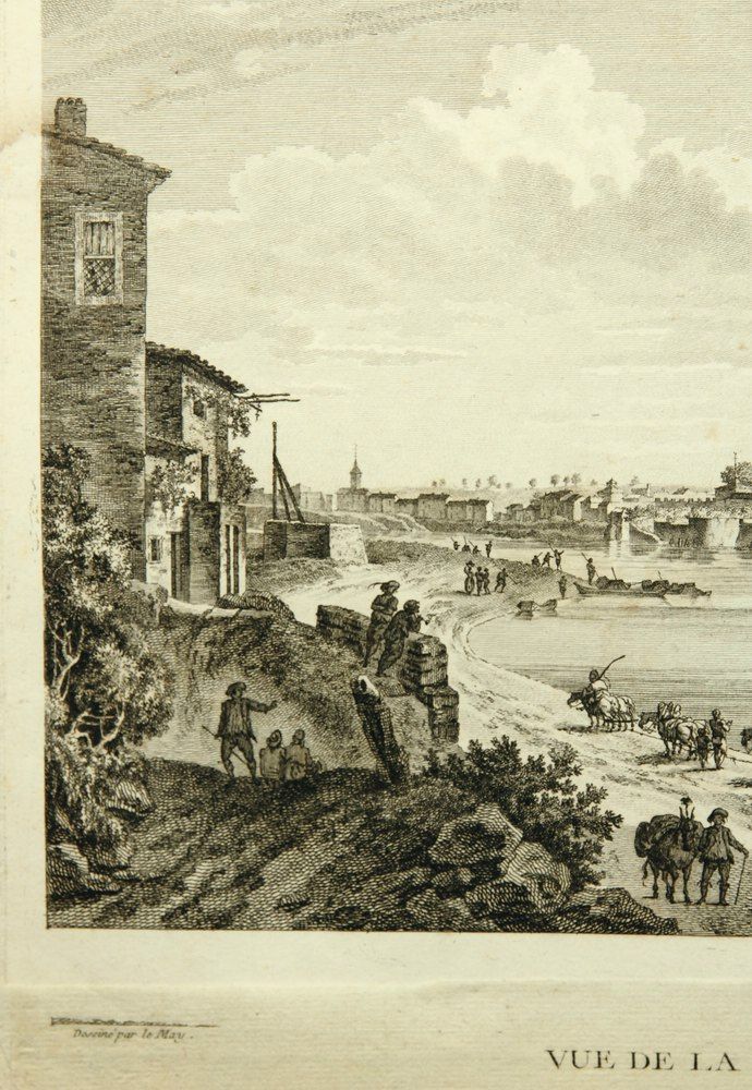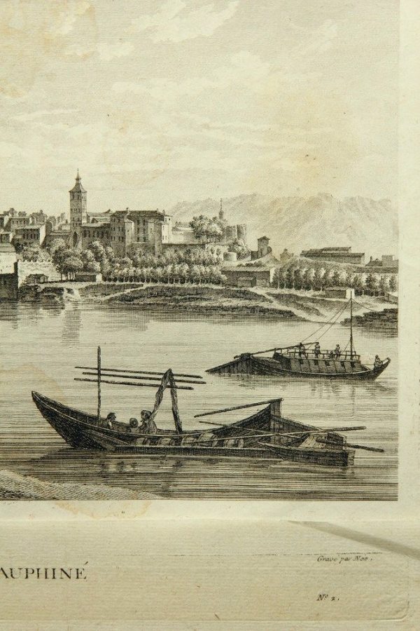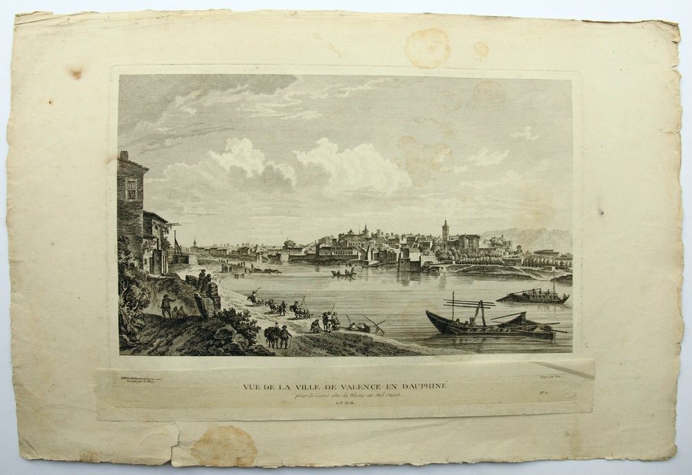 François Denis Née (um 1739 Paris – um 1817 ebd.) nach Olivier Le May (1734 Valenciennes – 1797 Paris), Stadtansicht von Valence am Ufer der Rhône, 18. Jahrhundert, Kupferstich