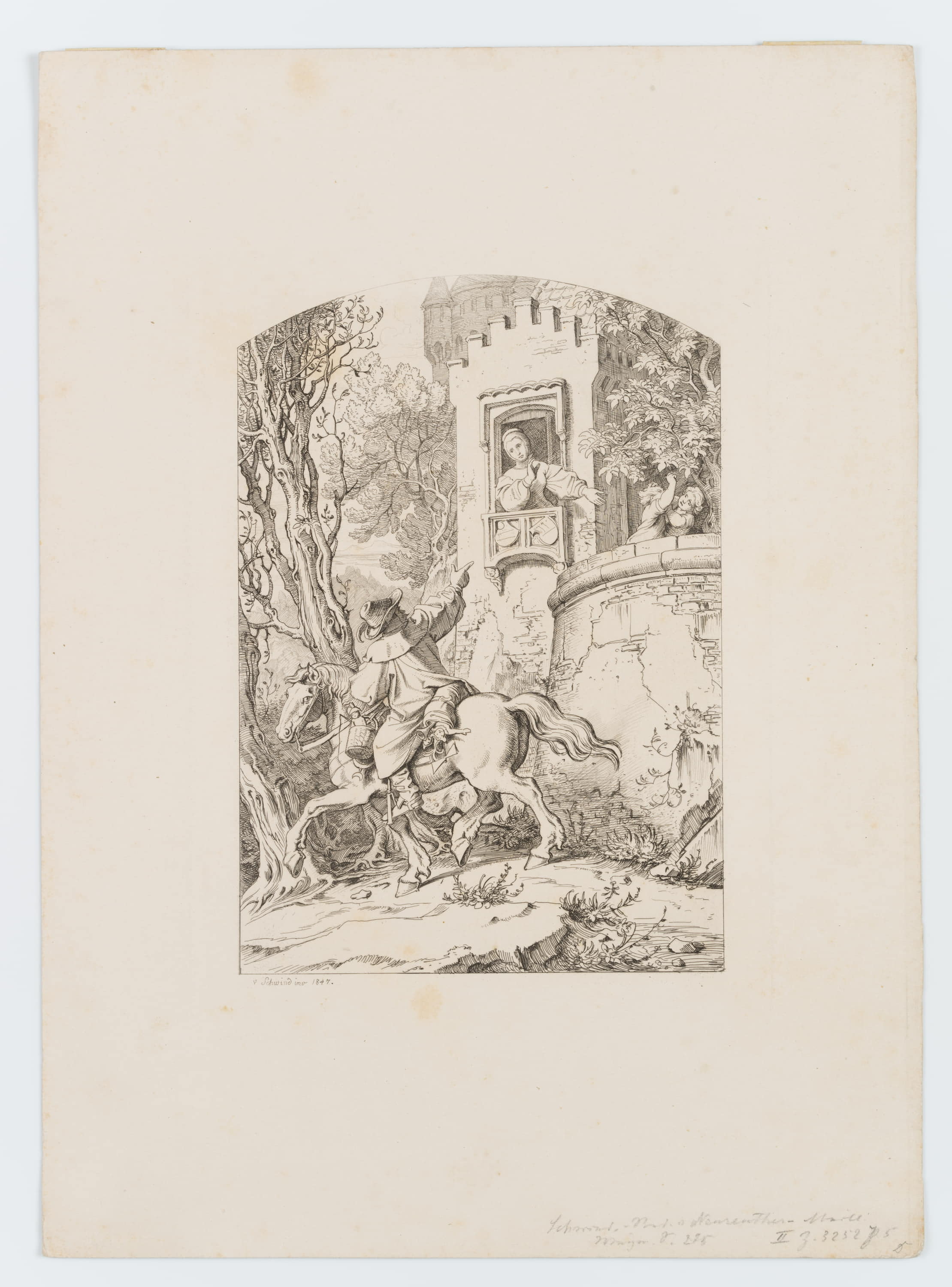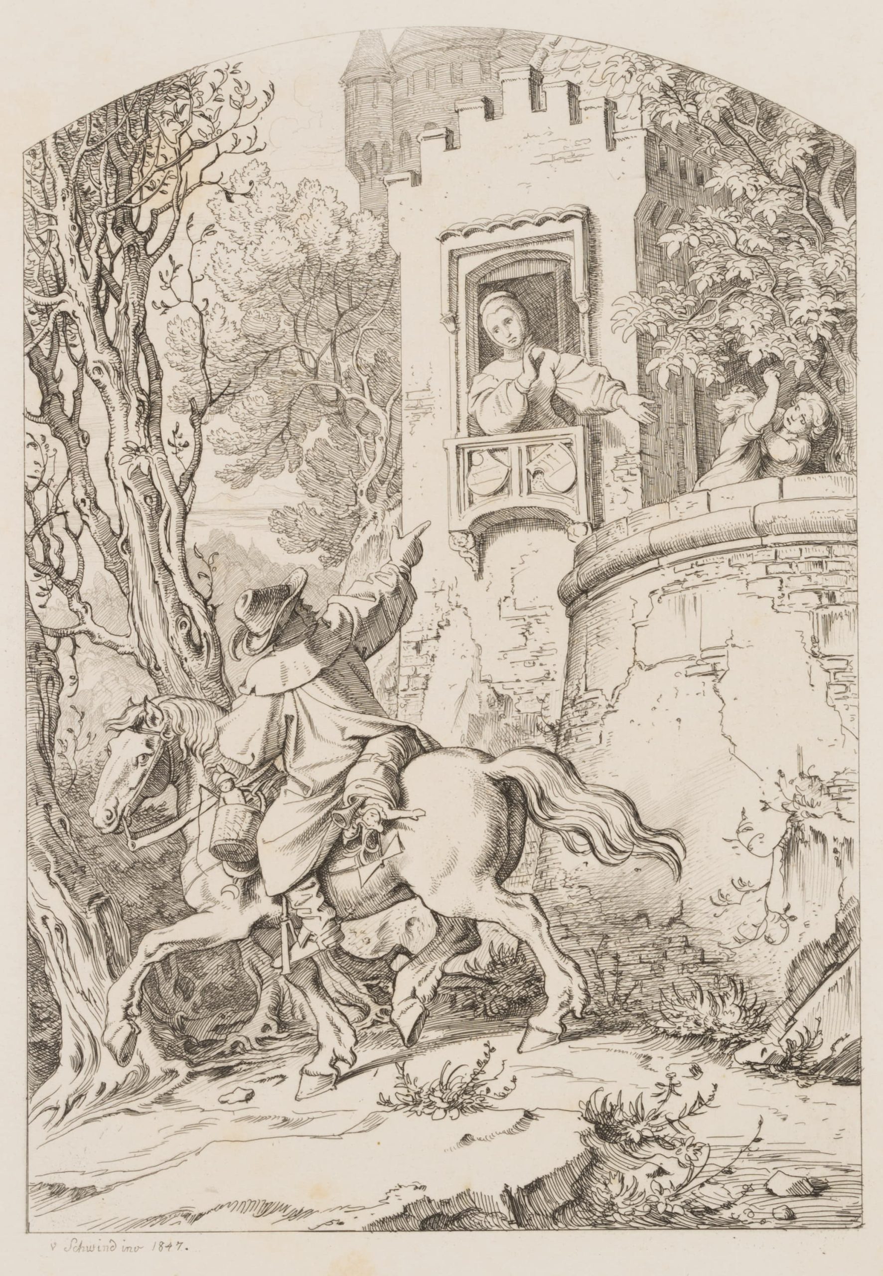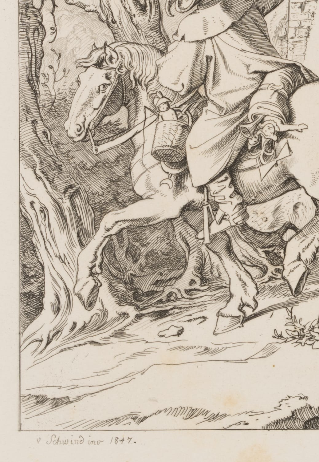 Eugen Napoleon Neureuther (1806 Munich – 1882 ibid.) after Moritz von Schwind (1804 Vienna – 1871 Munich), Illustration of “Vom Reitersmann” from Georg Scherer’s “Old and New Children’s Songs, 19th century, Etching