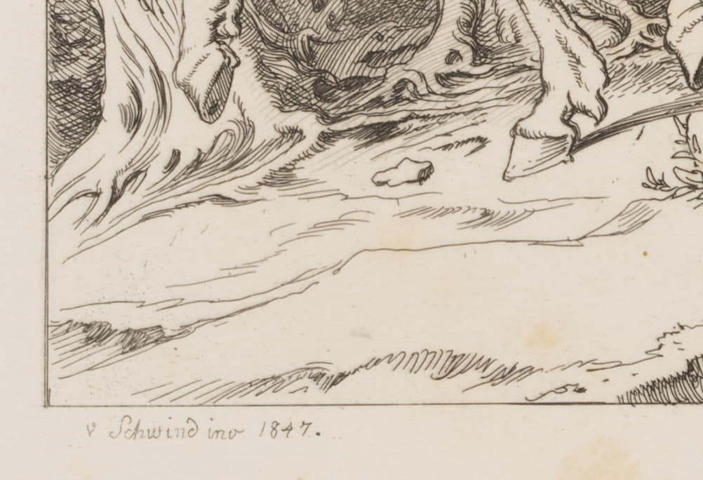 - Bezeichnung: unten links vom Künstler signiert und datiert “v. Schwind inv 1847.”, verso unbekannter Sammlungsstempel “St.” in Kreis in rot