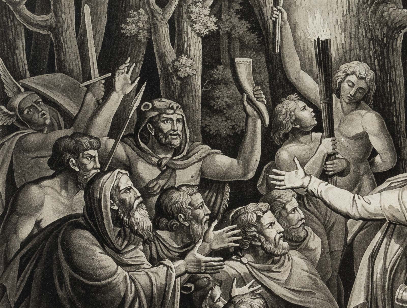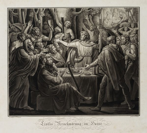 - Description: Signed below the image within the printing plate: “gezeichnet v. F. Dietrich / geätzt v. W. Nilson”, titled centrally below: “Livilis Verschwörung im Haine”, From. Ernst Münch, Pantheon der Geschichte des Teutschen Volkes, 1st vol., 5th issue, Freiburg (Schweizer) 1827. Berlin, Sammlung Archiv für Kunst und Geschichte. The print comes from a famous antiquarian bookshop in Munich. | Watermark: n.a.