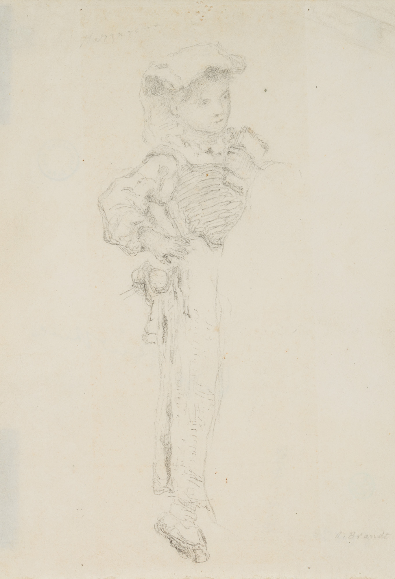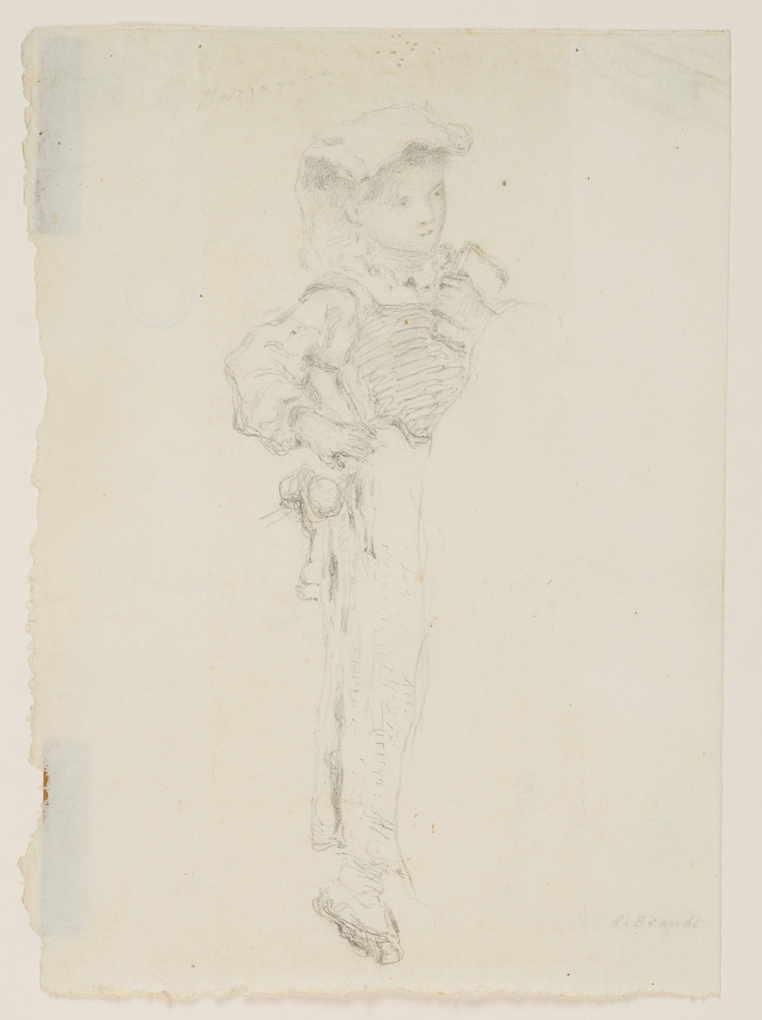 - Description: The child holds a book to his chest with his left hand. The right hand rests on his hip. The full-length portrait drawing is unfinished. Parts of the left half of the body are missing. Brandt studied at the Royal Prussian Academy of Arts in Berlin. From 1850 to 1852 he worked as an illustrator in Berlin. From 1850 to 1856 he took part in the Berlin academy exhibitions, around 1853 he was in Paris, where he studied in the studio of Lon Cogniet. Residing in Rome from 1854, Brandt was mainly active as a genre and landscape painter.