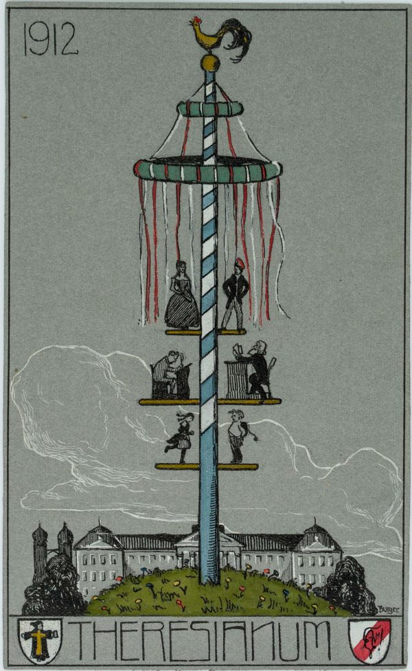 - Description: In the centre of the picture, the viewer sees a traditional maypole. For the trunk, painted according to Bavarian tradition, Burger used the Bavarian lozenges as a model, which represent the white-blue sky and run from the lower left to the upper right. Burger’s maypole is additionally decorated with detailed panels of guilds, such as that of the teaching profession. In the lower part of the picture the Theresianum is depicted in the background and to the left the Munich Frauenkirche. Signed “Burger” in the lower right-hand corner of the image, dated 1912 in the upper left-hand corner, and inscribed “Theresianum” below the image.