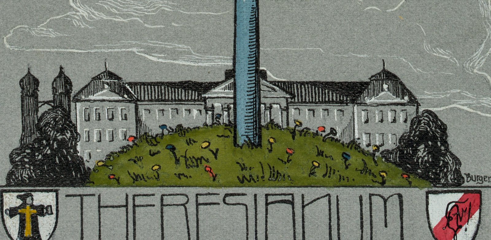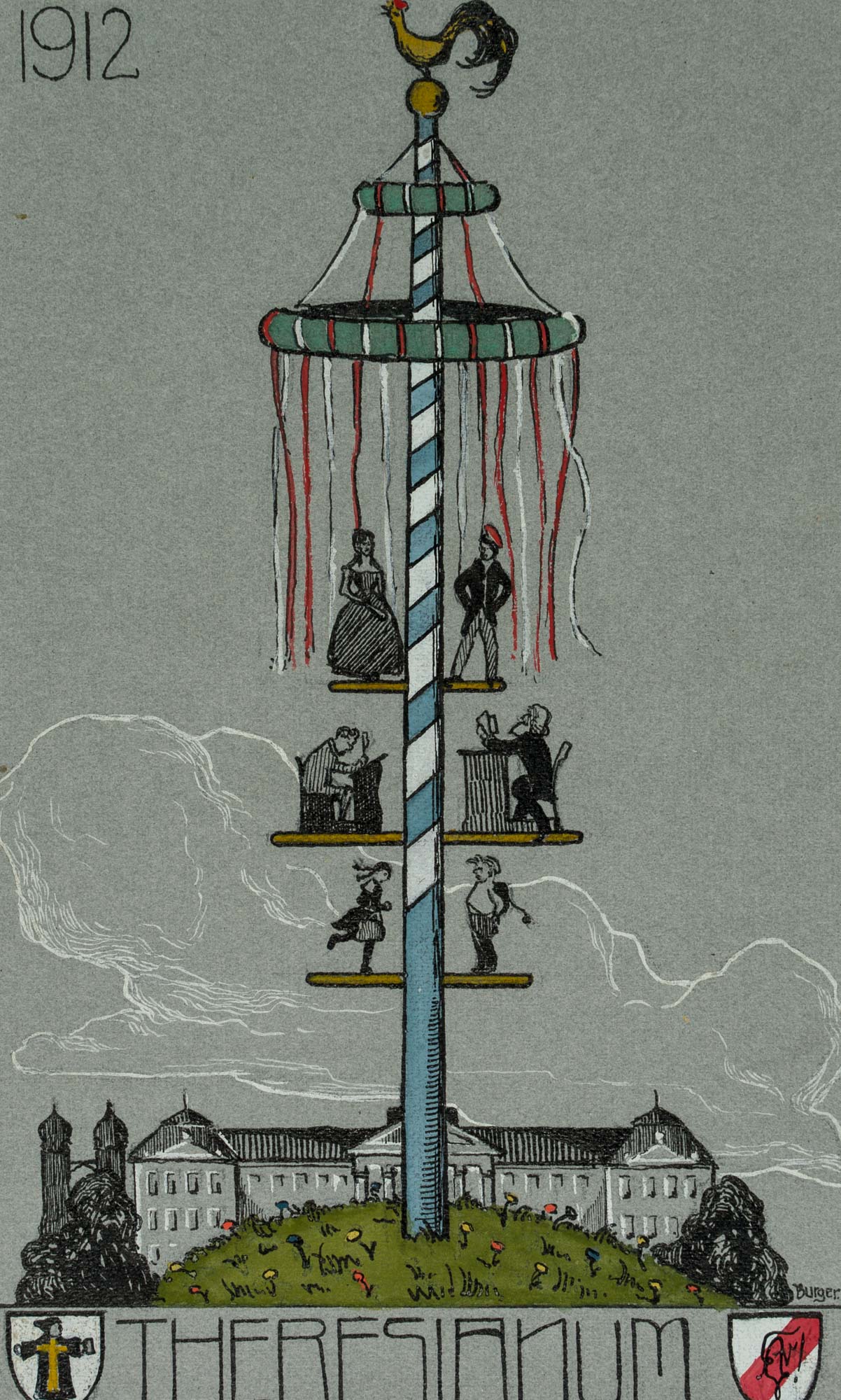- Beschreibung: Im Zentrum des Bildes erblickt der Betrachter einen traditionellen Maibaum. Für den nach bayerischer Tradition bemalten Stamm dienten Burger die bayerischen Rauten als Vorlage, die den weiß-blauen Himmel darstellen und von links unten nach rechts oben verlaufen. Burgers Maibaum ist zusätzlich mit detailliert gestalteten Tafeln von Zünften geschmückt, wie etwa mit der des Lehrerberufs. Im unteren Bildbereich ist im Hintergrund das Theresianum und zur Linken die Münchner Frauenkirche dargestellt. In der Darstellung unten rechts signiert mit “Burger”, oben links datiert auf 1912. Unter der Darstellung Bezeichnung “Theresianum”.