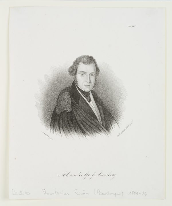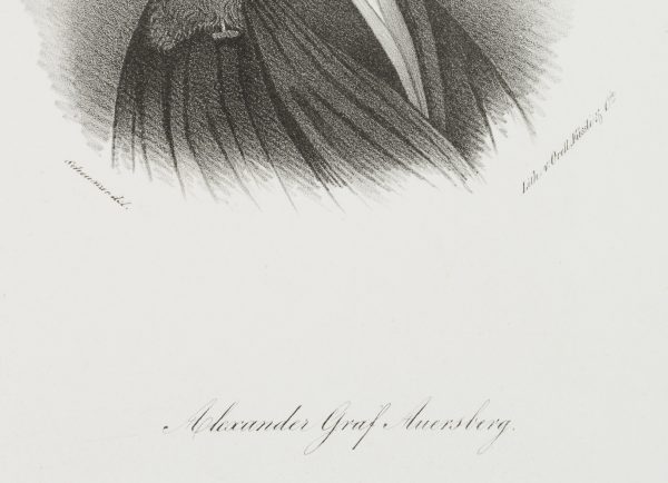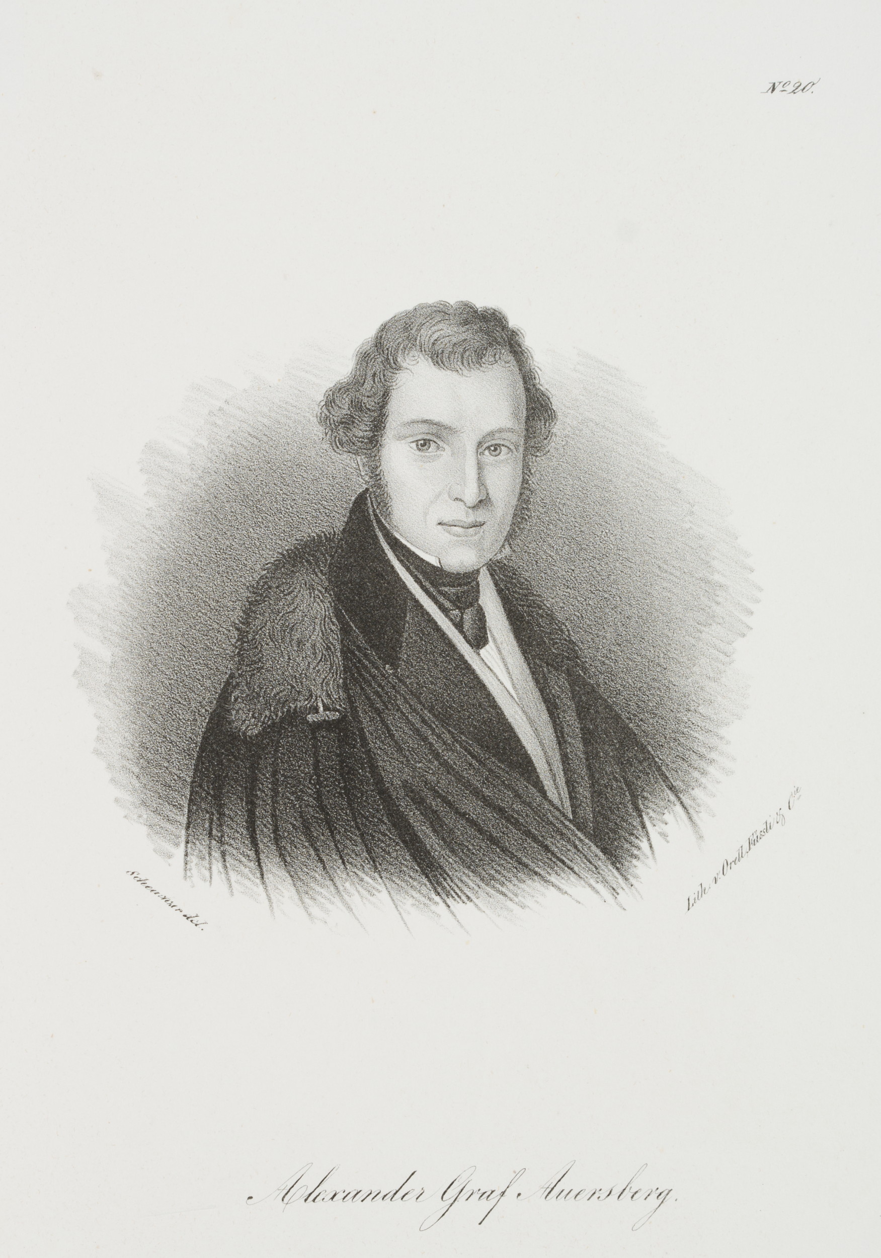 - Bezeichnung: Unten mittig im Druck signiert: “Scheunzer[?] del | Lith. v. Orell Füssli”. Unten mittig im Druck bezeichnet: “Alexander Graf Auersberg”. Oben rechts im Druck nummeriert: “N.20”.