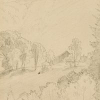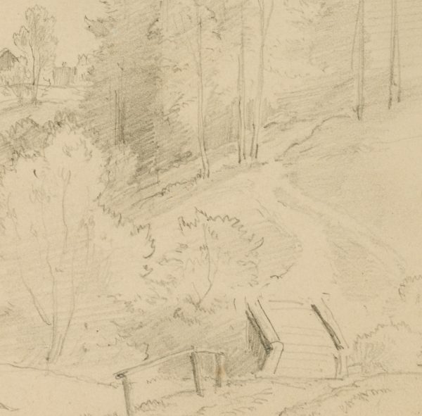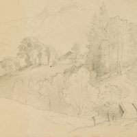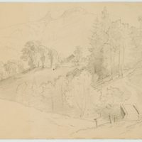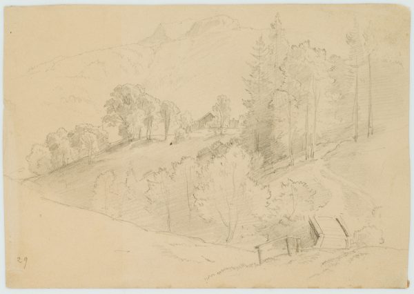 A rustic mountain hut can be discovered amidst a hilly landscape of trees. The viewer is invited to follow the path over the footbridge at the right edge of the picture and to run his eyes along the charming drawing. The German painter Otto Gebler studied in Dresden from 1858, later in Munich under Karl von Piloty. Of his numerous paintings, which he exhibited from 1864 onwards in Berlin, Dresden and Munich, sometimes also in Vienna, Paris and London, several found their way into public museums. The painting ‘Reinekes Ende’ (Fox and Three Dachshunds), for example, is in the Pinakothek in Munich. He was an honorary member of the Munich Academy of Fine Arts, later he also received the title of professor. His estate consists of about 50 oil paintings and sketches, 17 sketchbooks and over 60 drawings. - Date: 19th century