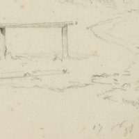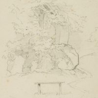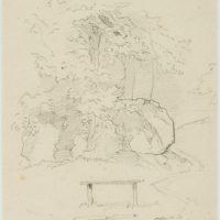 Sehr reizvolle Naturstudie mit Darstellung des gekreuzigten Christus. Inmitten des Laubwerks eines Waldes ist bei genauem Hinsehen ein Kruzifix zu sehen. Mit großem Stein am Waldrand; im Vordergrund eine einfache Holzbank. - Datierung: 1867