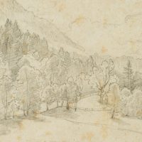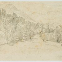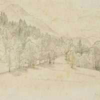 Rich sketch of the Bavarian Highlands: Forest fringe in front of mountains. The German painter Otto Gebler studied in Dresden from 1858, later in Munich under Karl von Piloty. From his numerous paintings, which he exhibited from 1864 onwards in Berlin, Dresden and Munich, sometimes also in Vienna, Paris and London, several of them found their way into public museums. The painting ‘Reinekes Ende’ (Fox and Three Dachshunds), for example, is in the Pinakothek in Munich. He was an honorary member of the Munich Academy of Fine Arts, later he also received the title of professor. His estate consists of about 50 oil paintings and sketches, 17 sketchbooks and over 60 drawings. - Date: 1867