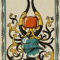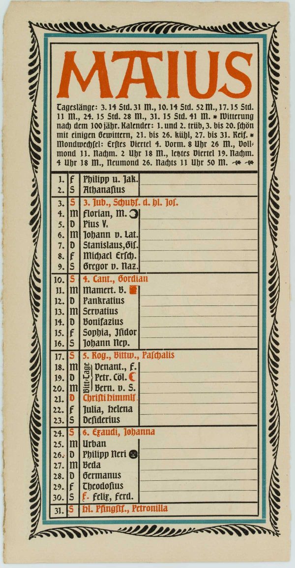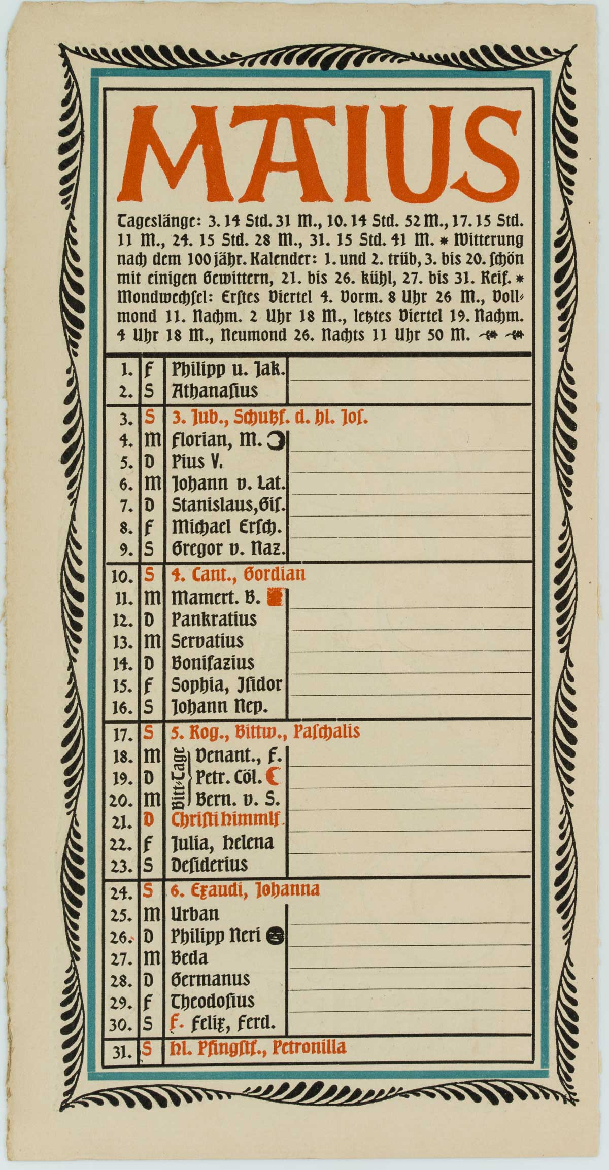 - Description: Named “Crailsheim”. Representation of the coat of arms of the von Crailsheim family. The family’s ancestral seat was the former Brandenburg-Ansbach town of Crailsheim in the Hohenlohe region in what is now north-eastern Baden-Württemberg. From the beginnings of the imperial knighthood until the end of the Holy Roman Empire, the Lords of Crailsheim belonged to the Frankish circle of knights. On the reverse a calendar page of the month of May. From the “Munich Calendars”, designed by Otto HUPP in the years 1885-1936.