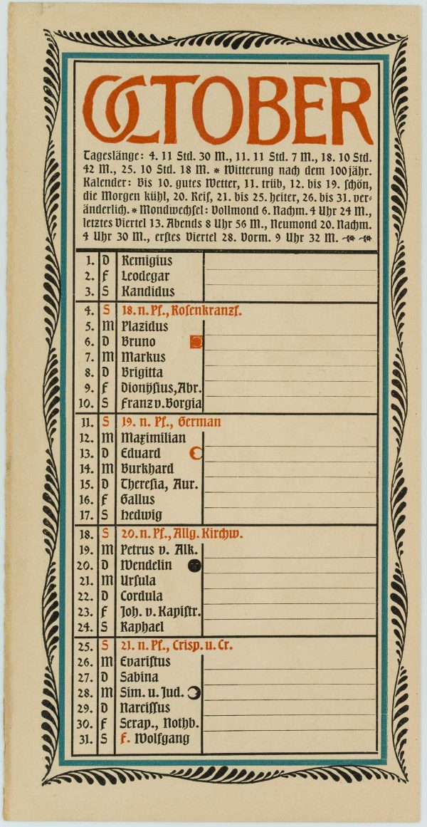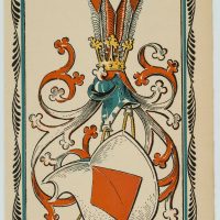 - Description: Inscribed at the bottom of the depiction “O.H.”, named “Schwerin”. Representation of the coat of arms of the von Schwerin family, an old noble family from Mecklenburg and Pomerania. Striking is the crowned, open helmet, on which three ostrich feathers can be seen, each with a rhombus of mixed colour. On the reverse a calendar page of the month of October. From the “Munich Calendars”, designed by Otto HUPP in the years 1885-1936.