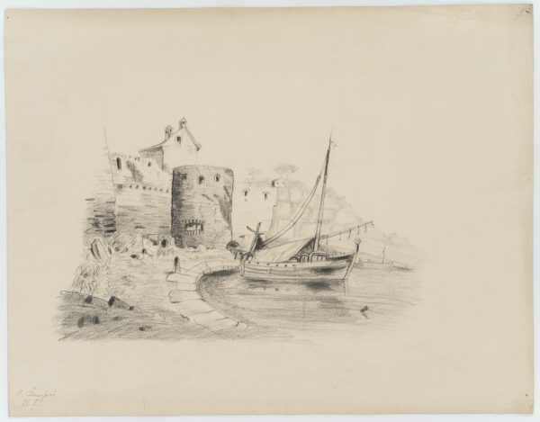 - Description: Romantic drawing from Kircheis’ sketchbook from a study trip. Showing an obsolete fortress wall at the small harbour basin of a village. A sailing boat is floating in the water.