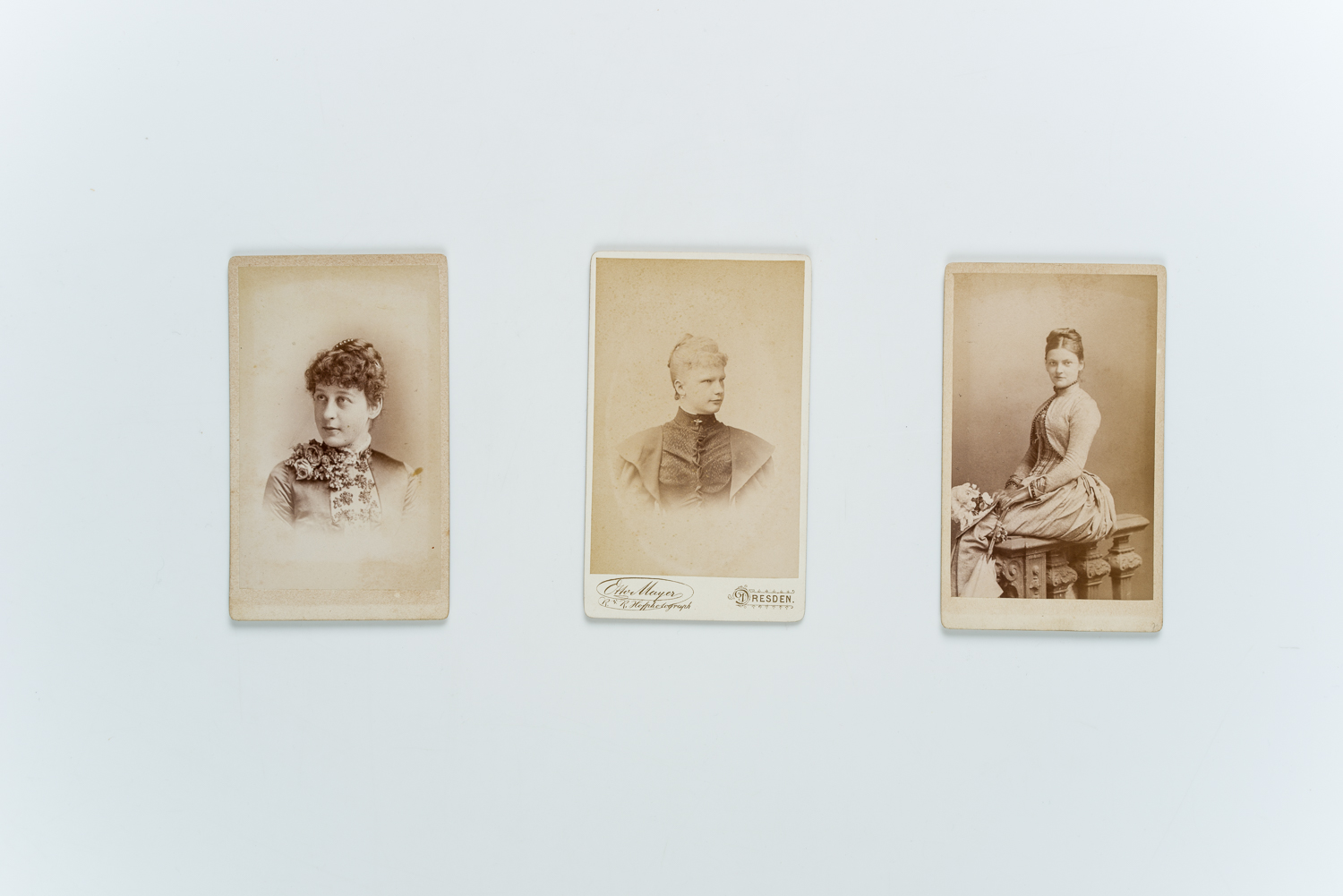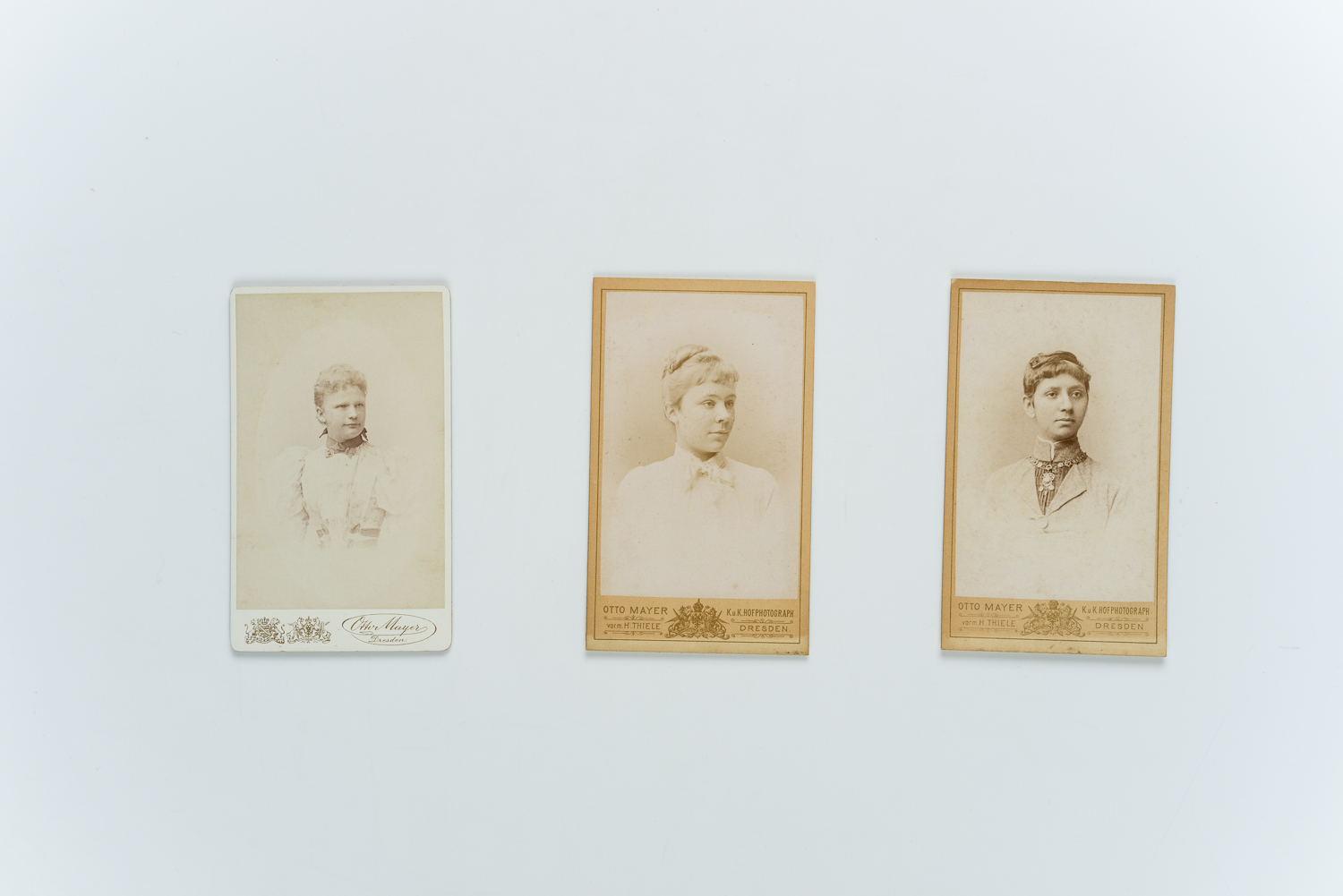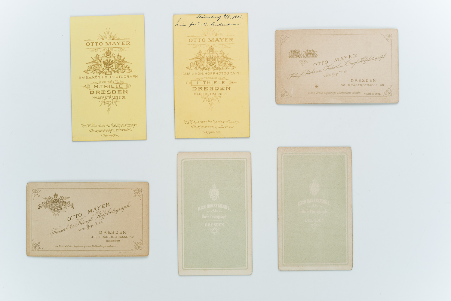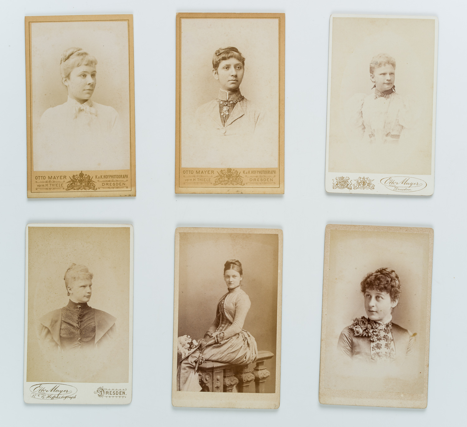 Fotografien von MAYER und HANFSTAENGL. 5 Brustbilder im Dreiviertelprofil, 1 Kniestück einer jungen Dame auf einer Balustrade sitzend. Die Karten aus dem Atelier Mayer sind unterhalb der Photographie mit dem Namen des Ateliers “Otto Mayer | Dresden” signiert. Rückseitig mit dem Logo des Ateliers bedruckt. Das Brustporträt einer jungen Dame mit Stehkragen und Kette ist auf der Rückseite mit “Bärenburg 9/8. 1886” datiert und bezeichnet.