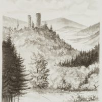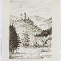- Description: Landscape with romantic castle ruins on a wooded hill. The vegetation and geography are reminiscent of the German low mountain ranges. A beautiful sense of depth is created through several successive levels of the picture and the use of differently dark or dense areas of ink.
