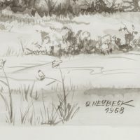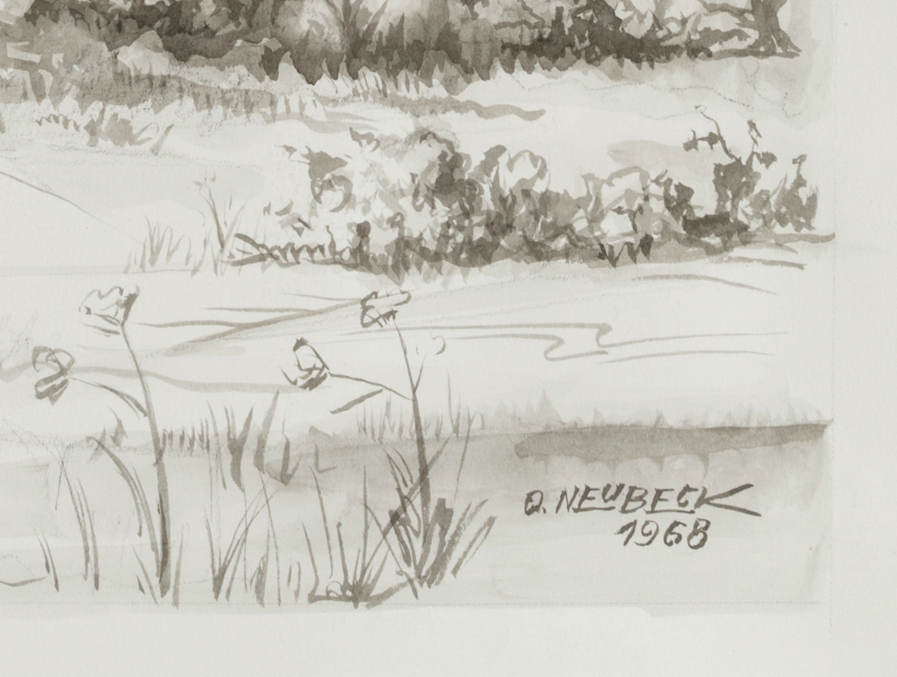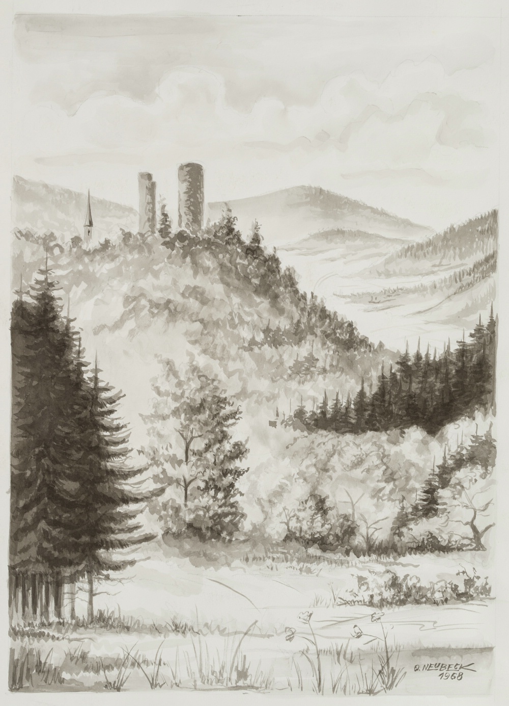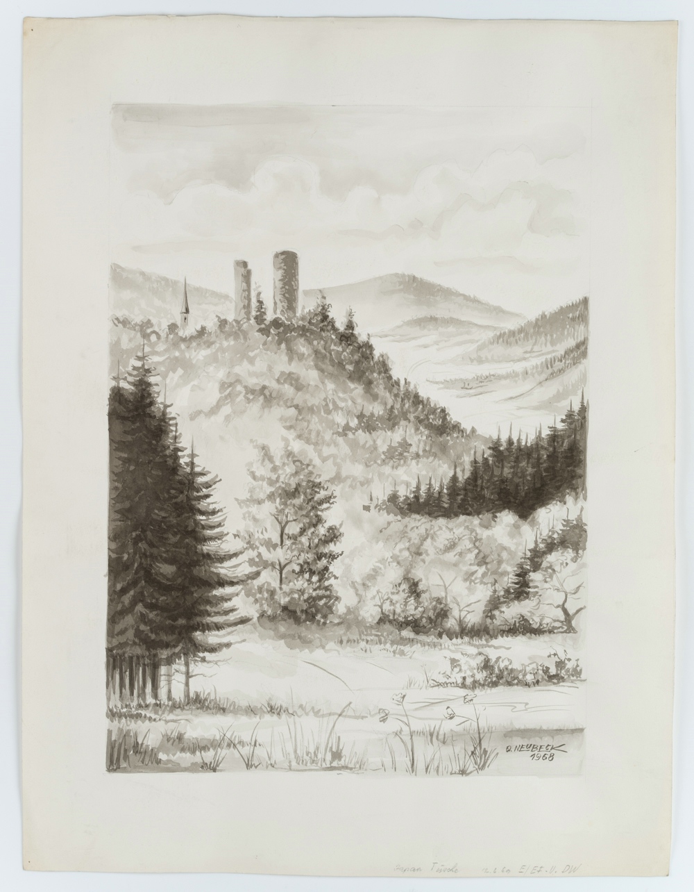 O. Neubeck (20. Jahrhundert), Burgenruine im Mittelgebirge, 1968, Pinselzeichnung