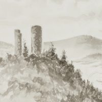 - Beschreibung: Landschaftsbild mit romantischer Burgenruine auf einem bewaldeten Hügel. Vegetation und Geographie lassen an die deutschen Mittelgebirge denken. Durch mehrere hintereinander gestaffelte Bildebenen und die Verwendung unterschiedlich dunkler bzw. dichter Tuscheflächen wird eine schöne Tiefenräumlichkeit erzeugt.