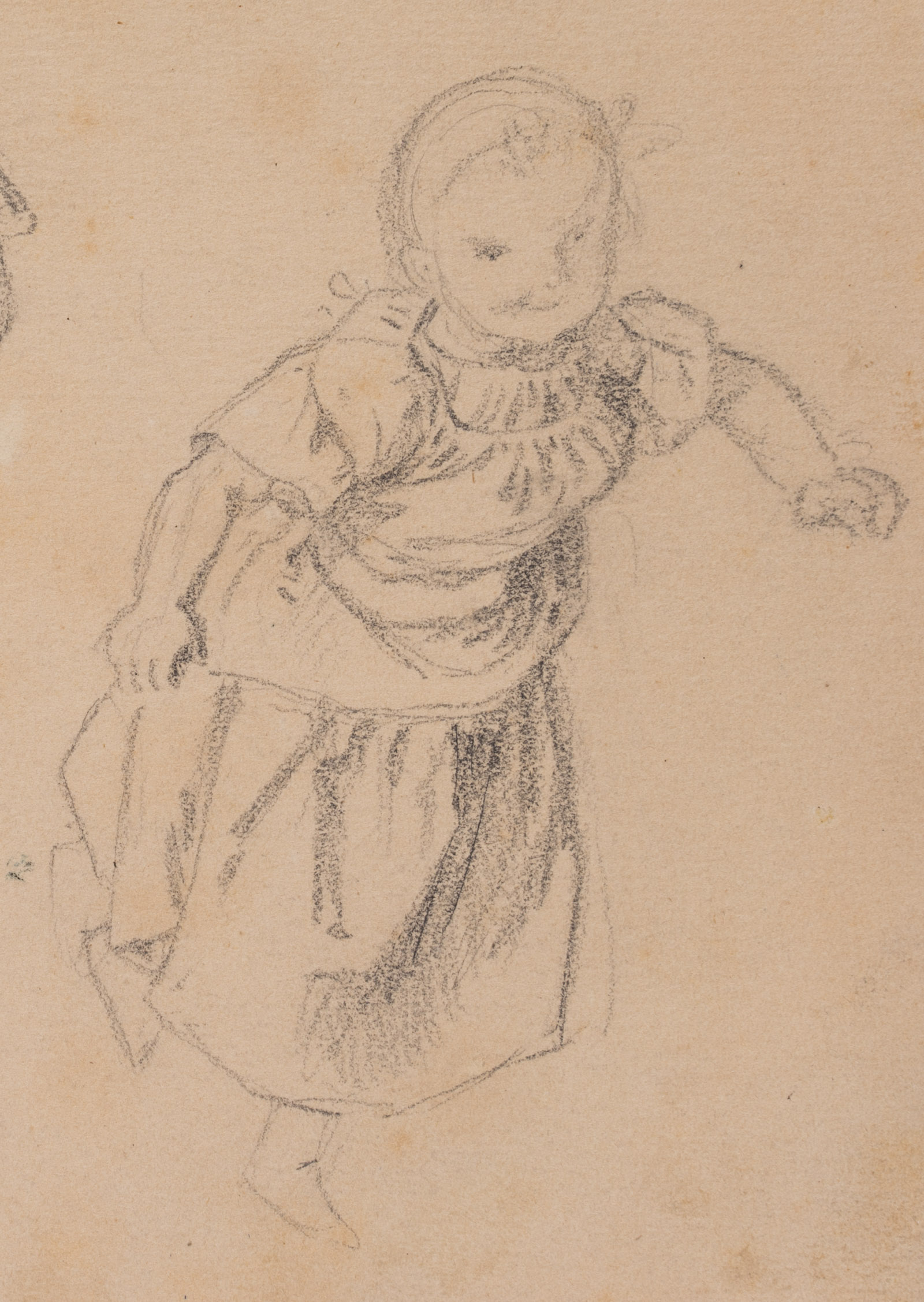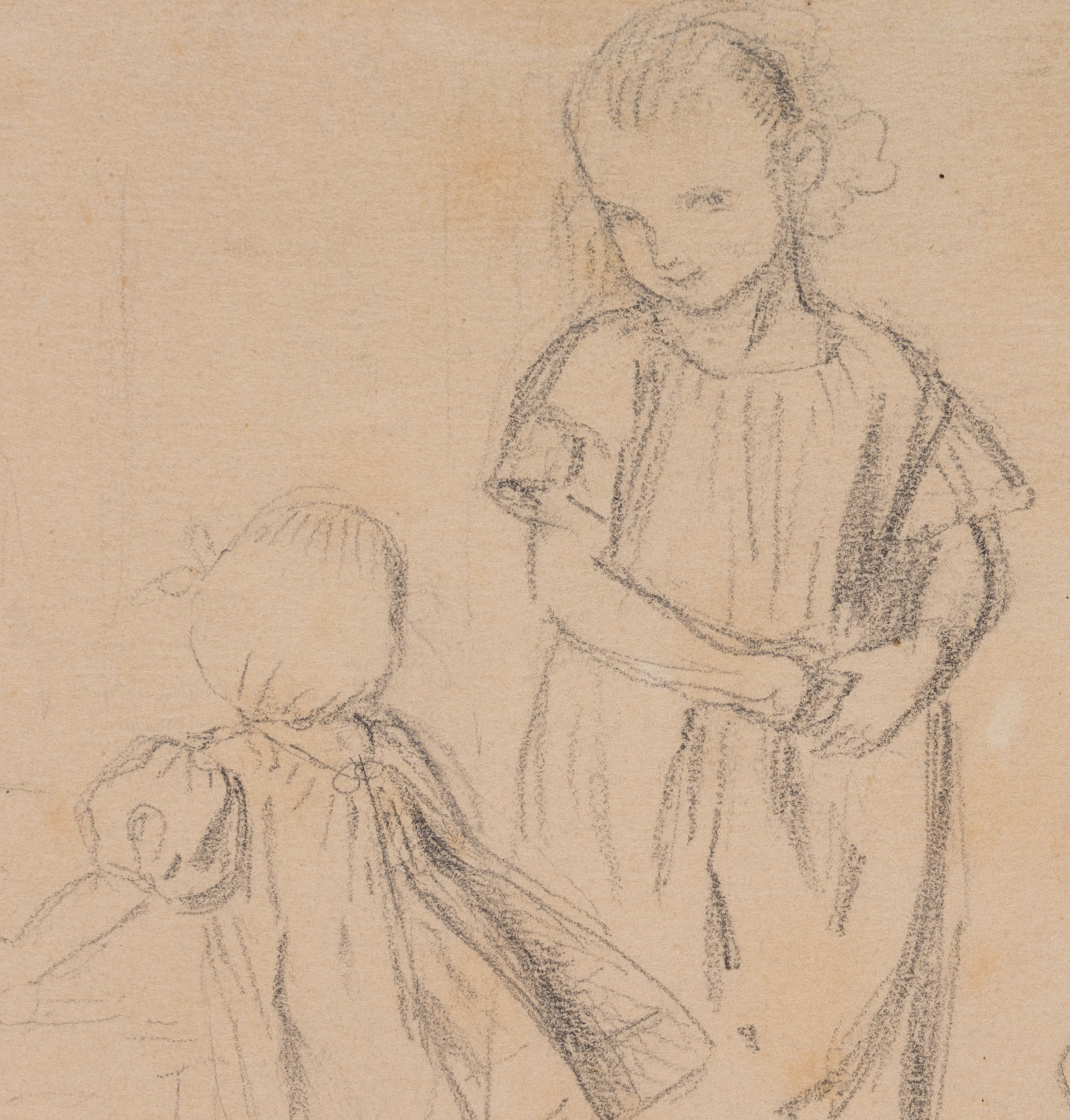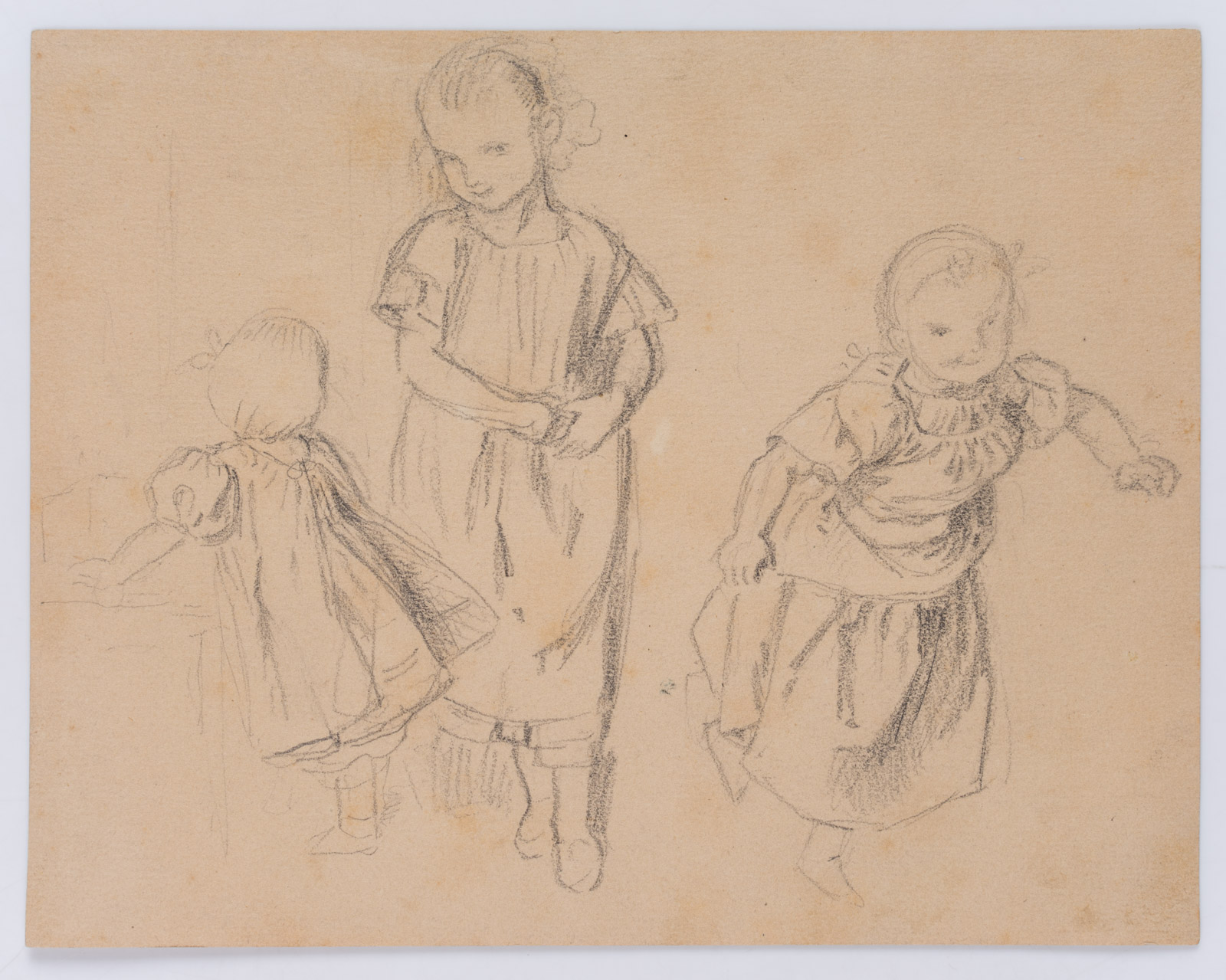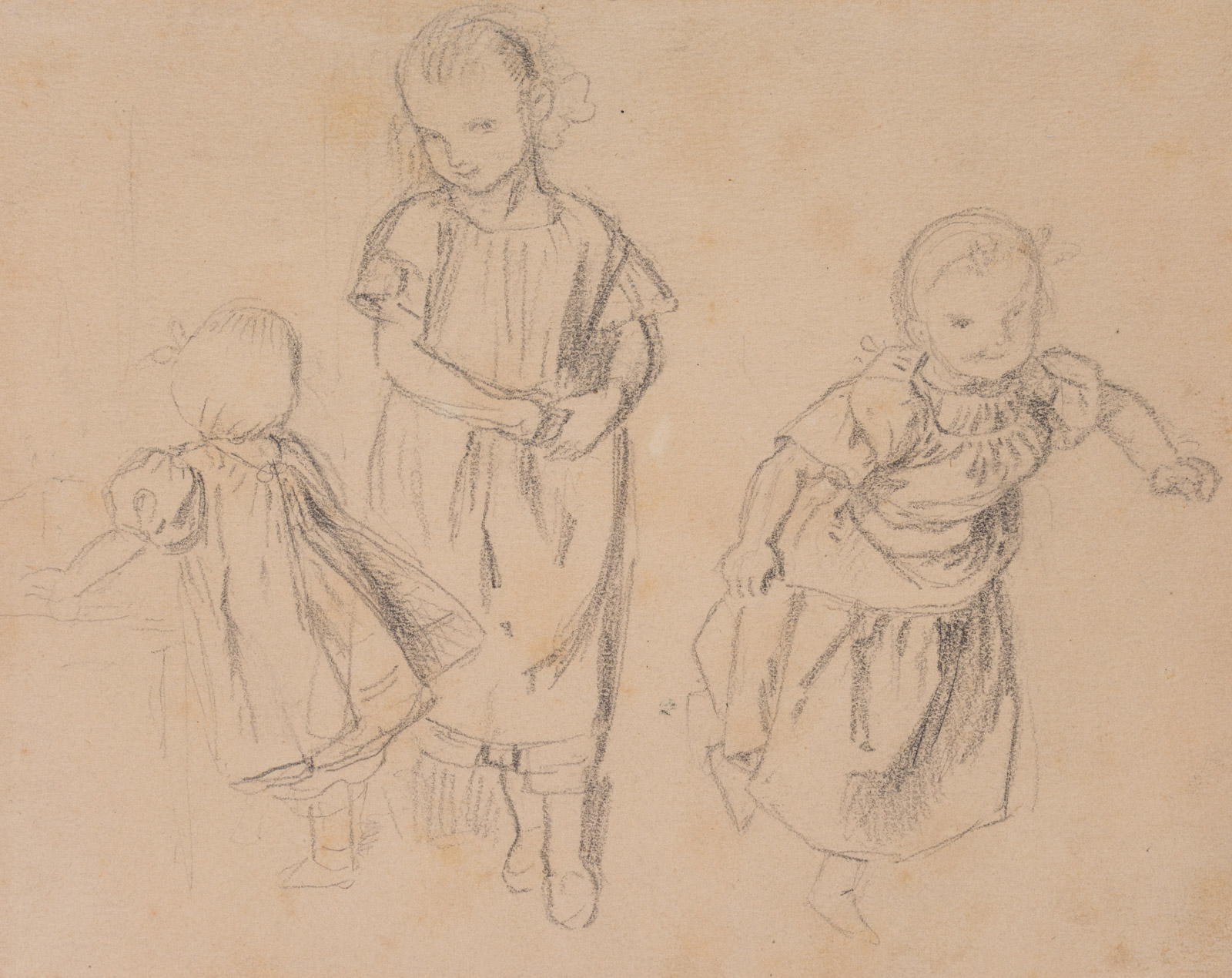 - Description: Study sketch from a domestic scene depicting three children, perhaps the artist’s daughters. From the estate of the famous genre painter Oskar Pletsch.
