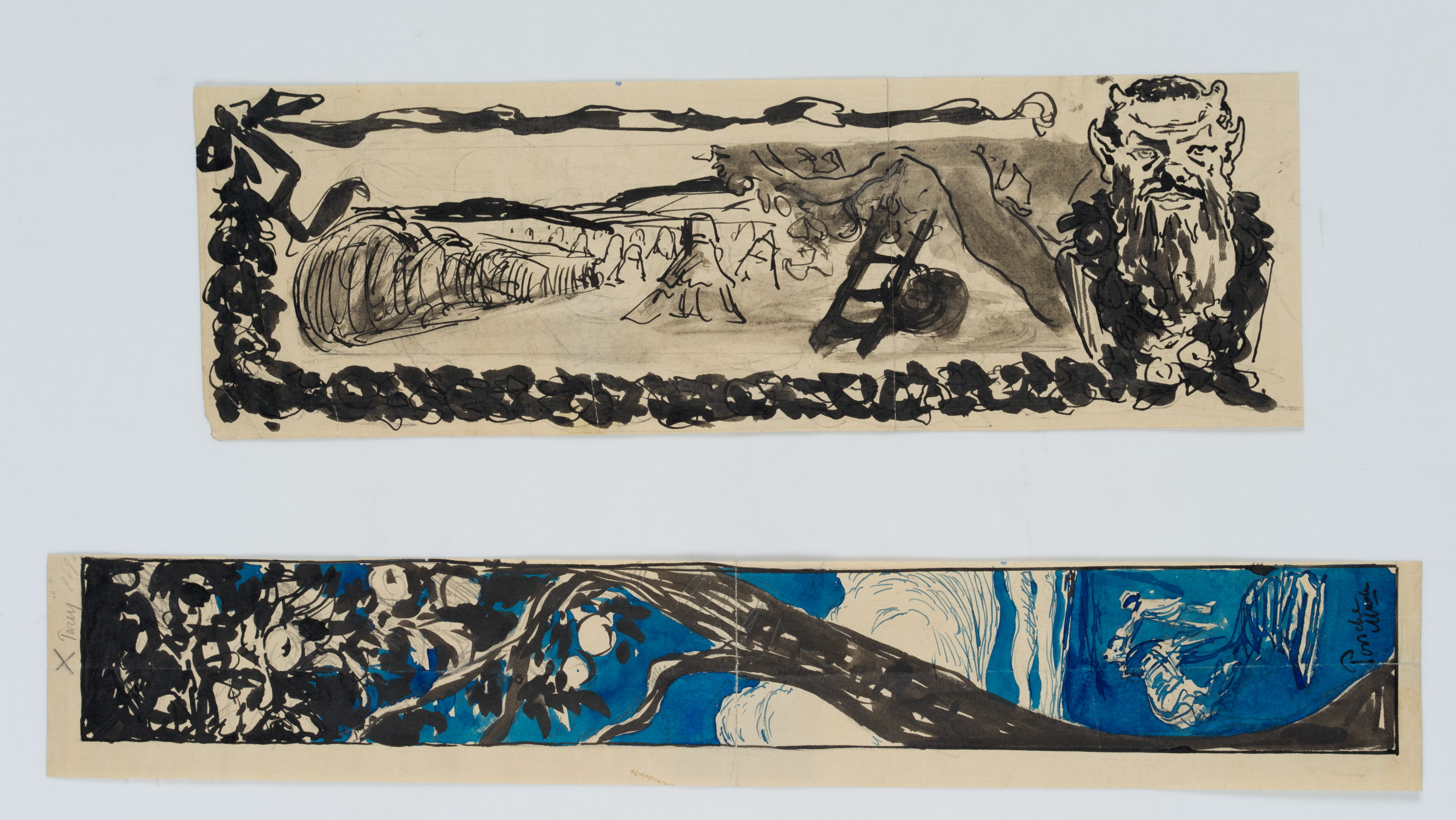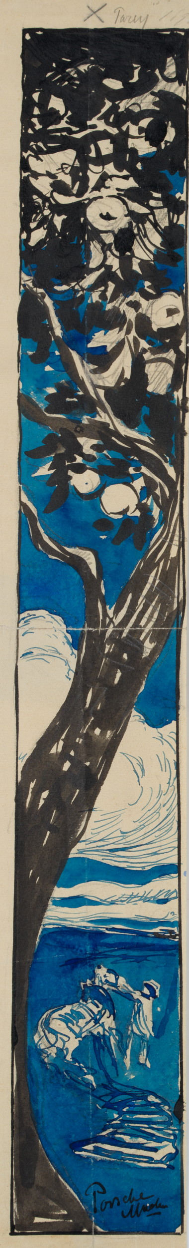 Otto Maria Porsche (1858 – 1931 ibid.), Two different illustrations decoratively designed Landscape with devil and horse with coachman under fruit tree, c. 1890, Watercolor