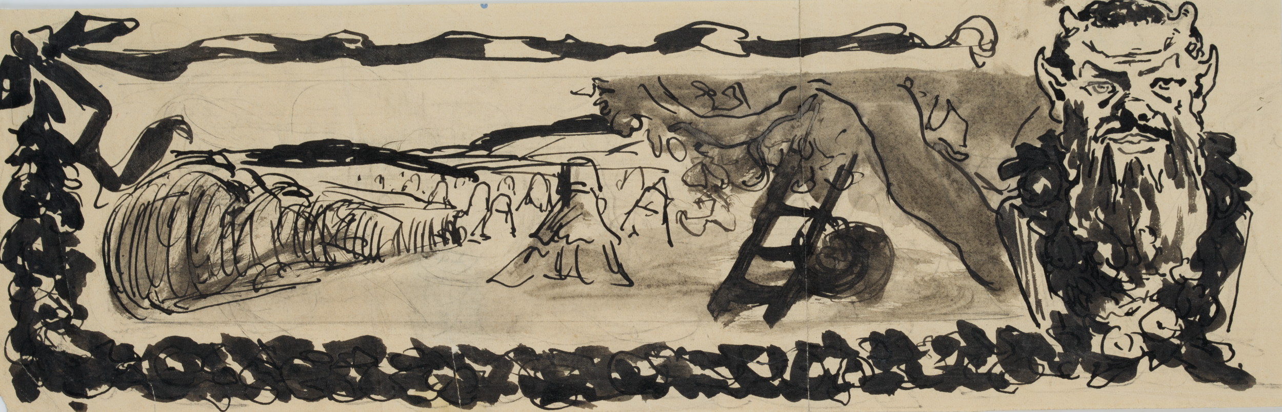 Otto Maria Porsche (1858 Gabel – 1931 München), Zwei unterschiedliche Illustrationen dekorativ gestaltet. Landschaft mit Teufel; Pferd mit Kutscher unter Obstbaum, um 1890, Aquarell