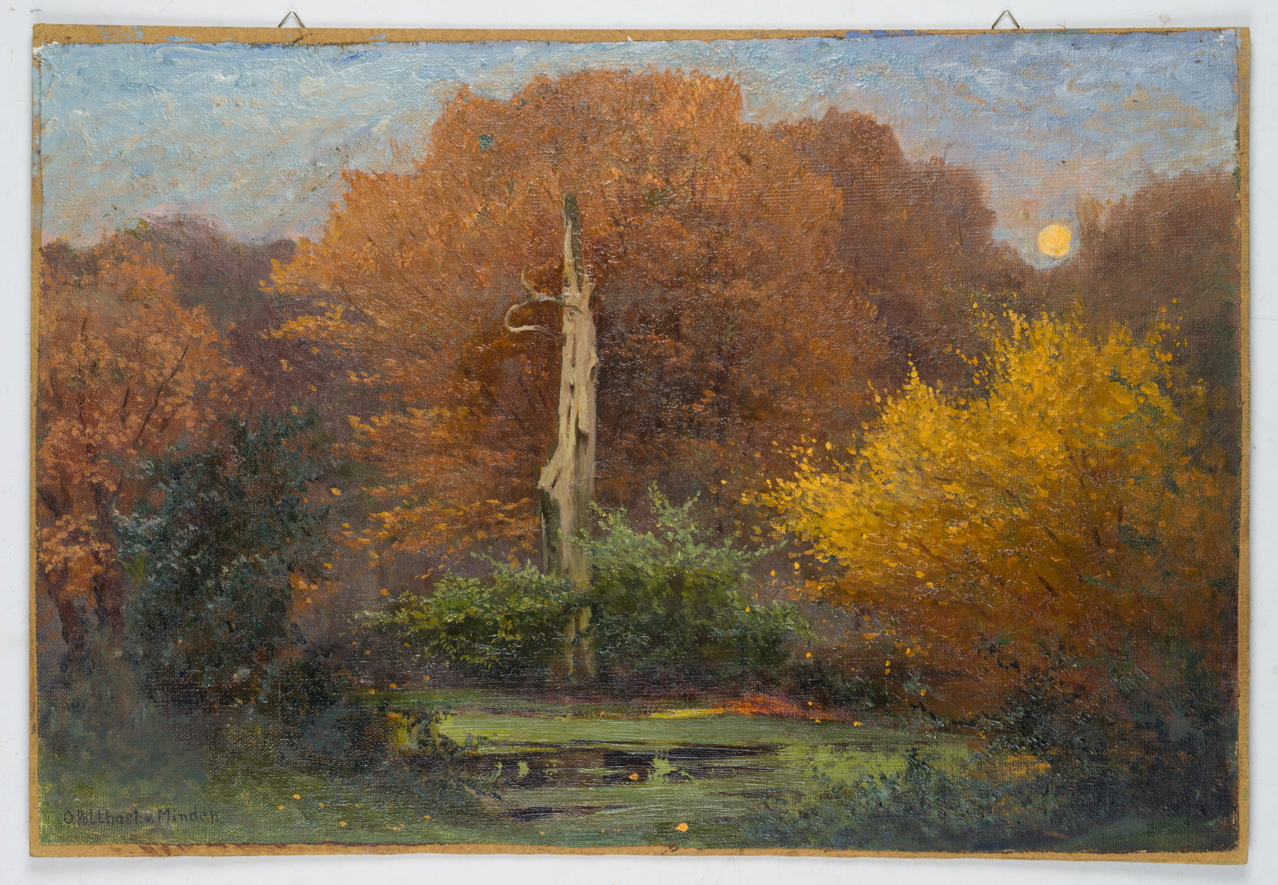 Olga Potthast von Minden (1869 Sanderbusch – 1942 Varel), Waldstück im Mondschein mit stillem Gewässer vor totem Baum umgeben von goldenen Herbstblättern, um 1910, Öl