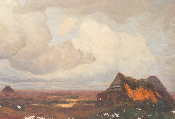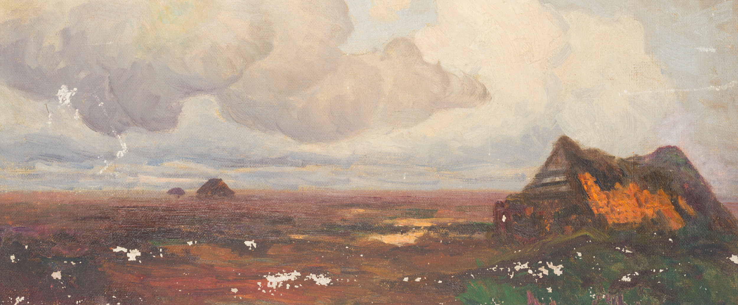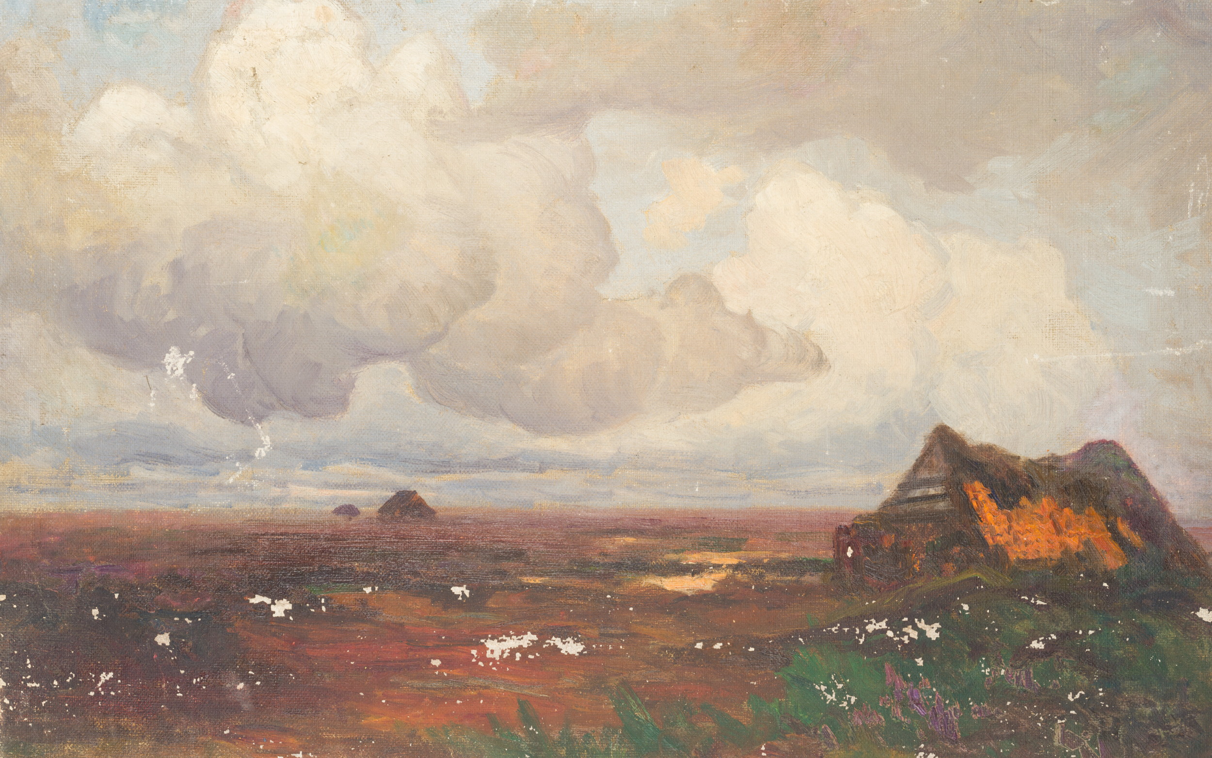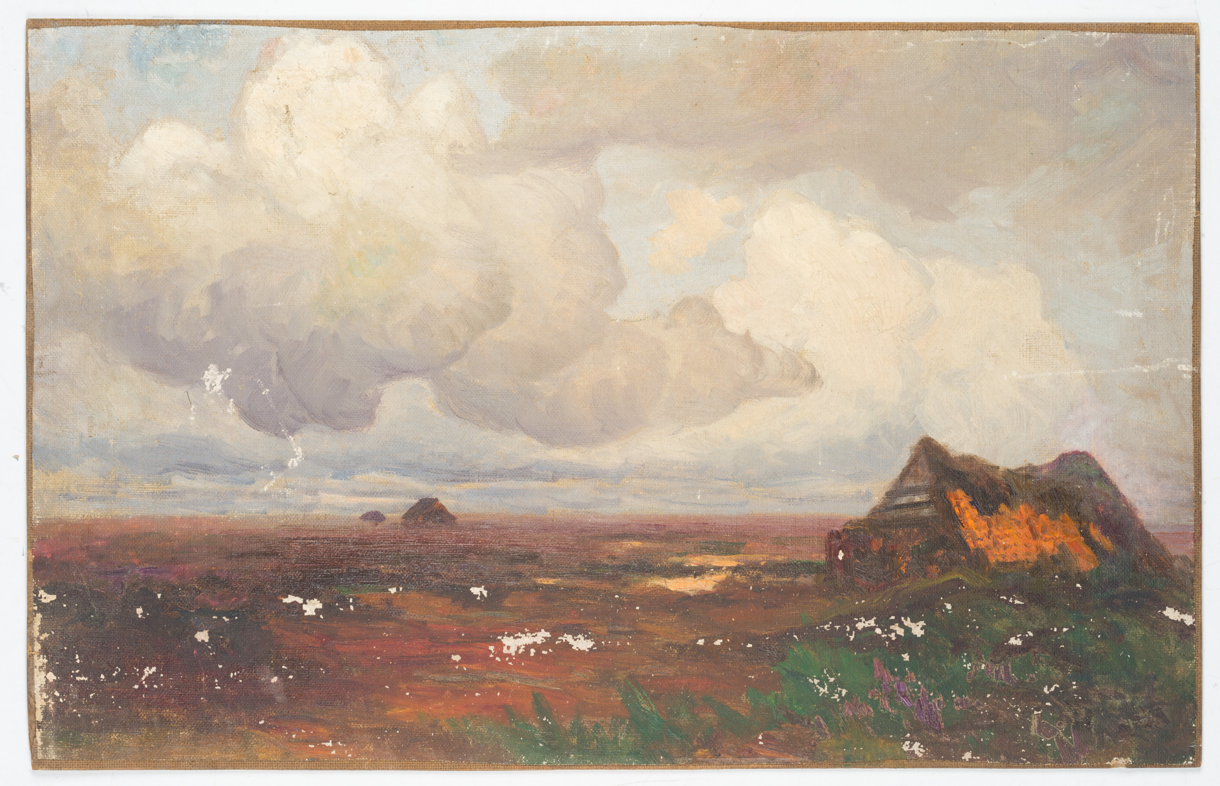Olga Potthast von Minden (1869 Sanderbusch – 1942 Varel), Low German moorland with isolated barns under a low cloudy sky, , Oil