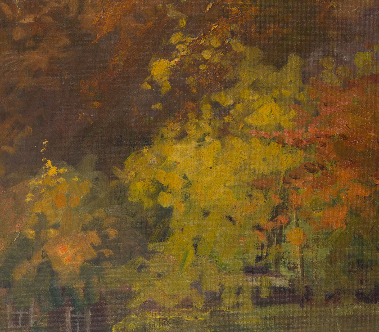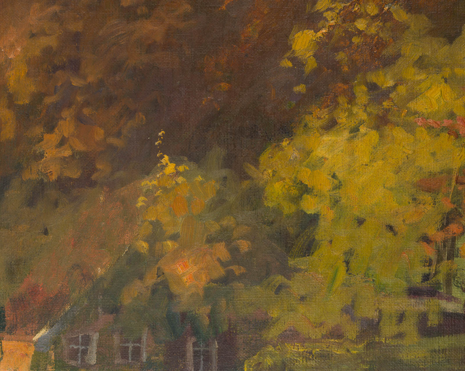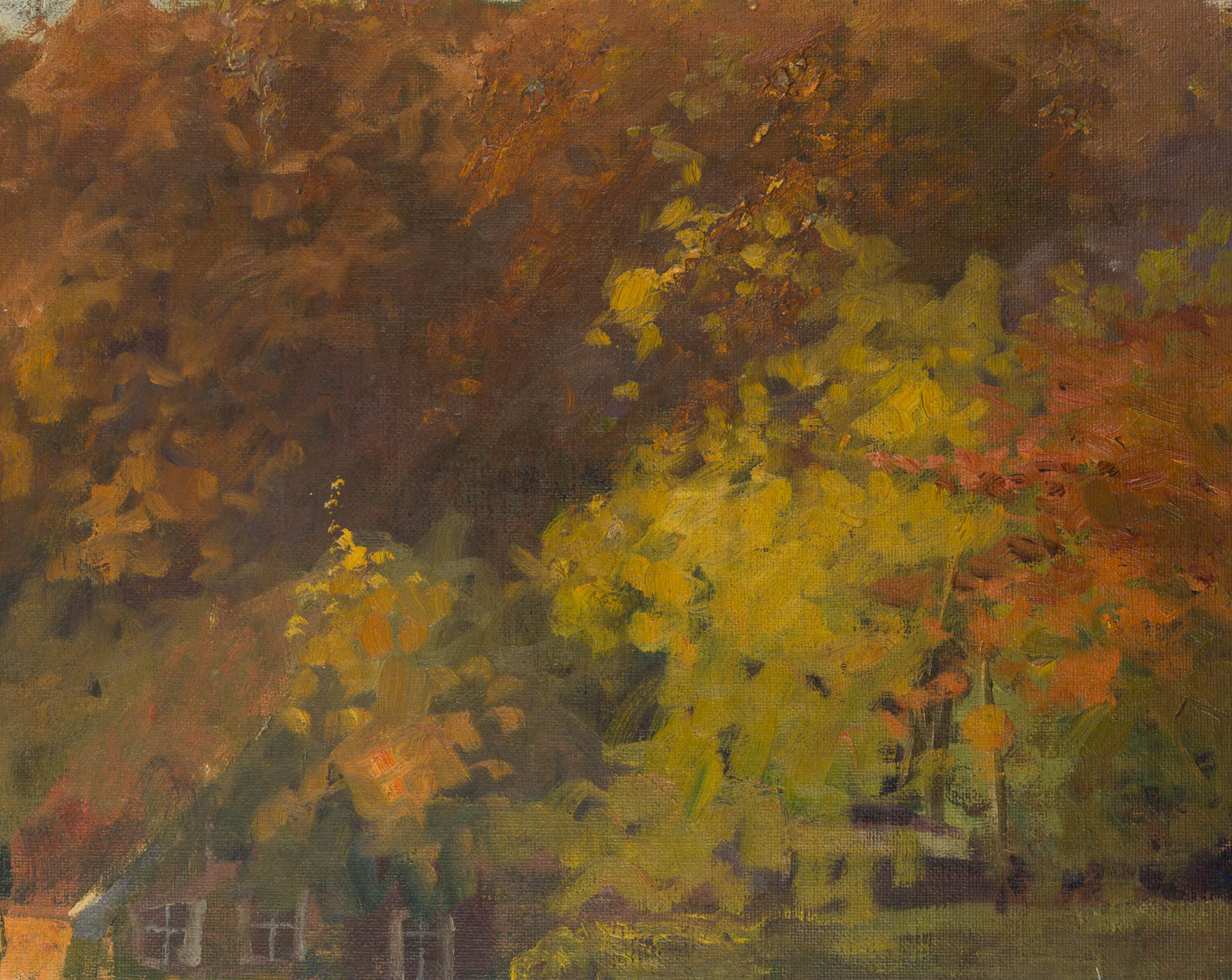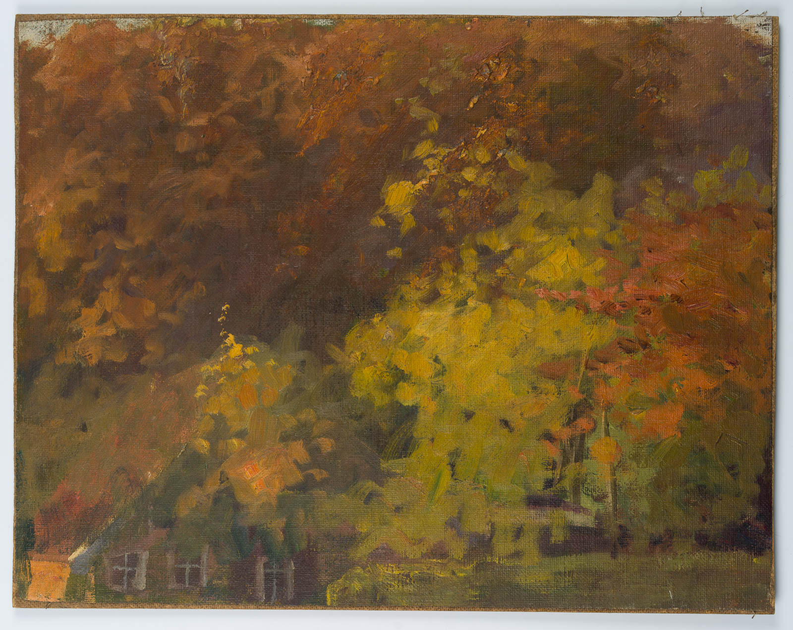 Die Arbeit stammt aus dem Nachlass der Künstlerin. - Schlagworte: Herbstbild, Herbsttag, Herbstbäume, Herbst, goldene Blätter, Haus, Giebel, Oldenburger Land, Varel, Heimatmalerei, Landschaft, Natur, Deutschland, Impressionismus, 1900-1924
