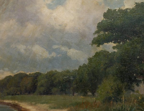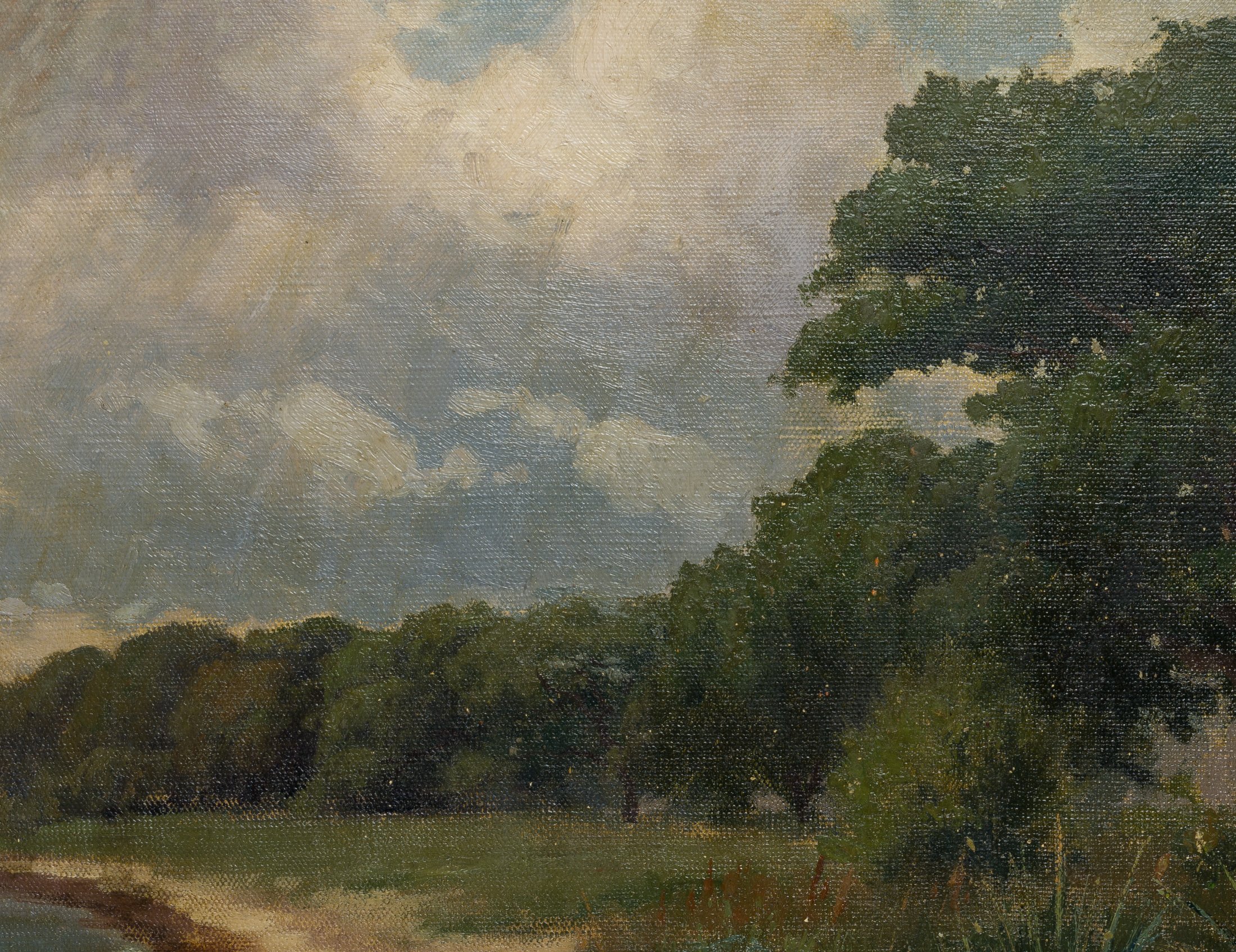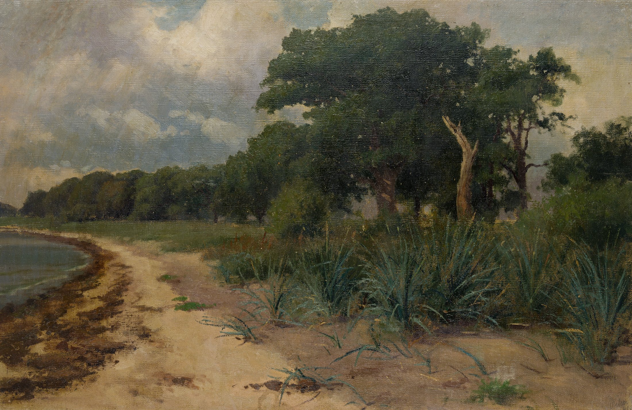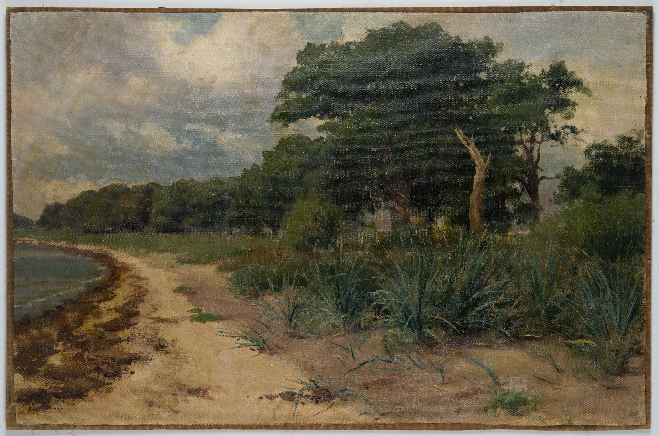 - Description: The artist Olga Potthast von Minden, born in Varel and daughter of a family of civil servants, began as a portrait painter and was taught in Berlin by the famous painter Anton von Werner. Later she became a pupil of Julius Preller (1834 to 1914), a painter from Varel, previously director of the Varel ironworks. Inspired by Preller, she devoted herself to landscape painting and undertook study trips to the Lüneburg Heath, the Vosges, the Eifel, as well as to islands on the North Sea and the Baltic Sea. The works offered here show naturalistic landscapes of her homeland, which are given an impressionistic character by the impasto application of the brush. We see colourful skyscapes, sunlit meadows or waves breaking on cliffs. They get by without a staffage of people and yet do not appear empty or forbidding, but calm and dreamy. Despite the naturalistic rendering, the pictures take on a poetic content through the use of light and the play of colour. The quality of the works is particularly high and is in no way inferior to the quality of Julius Preller.