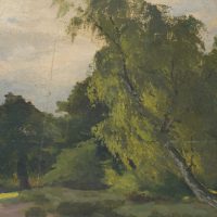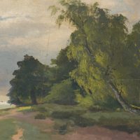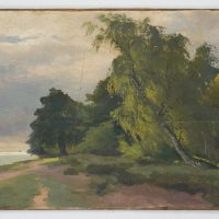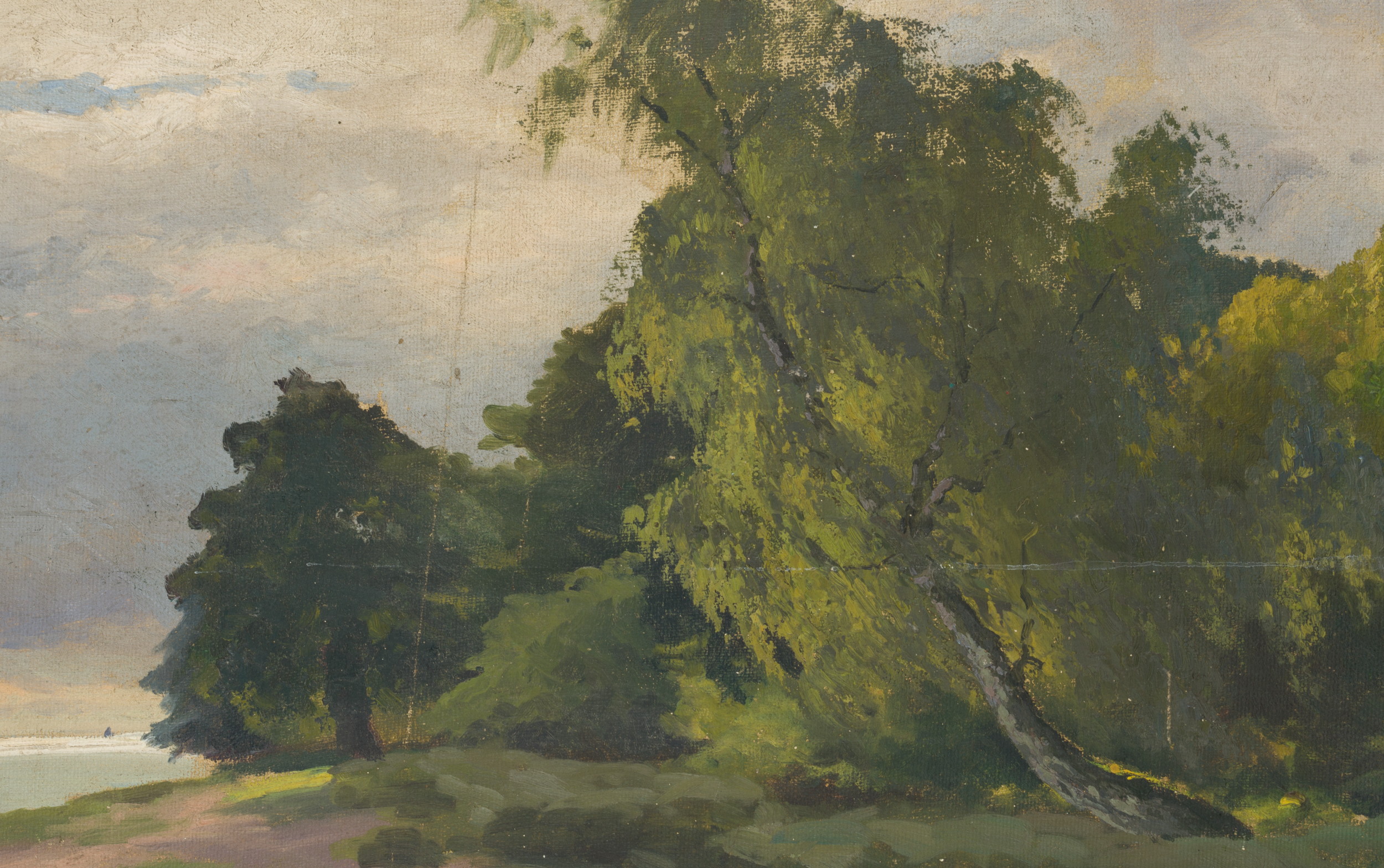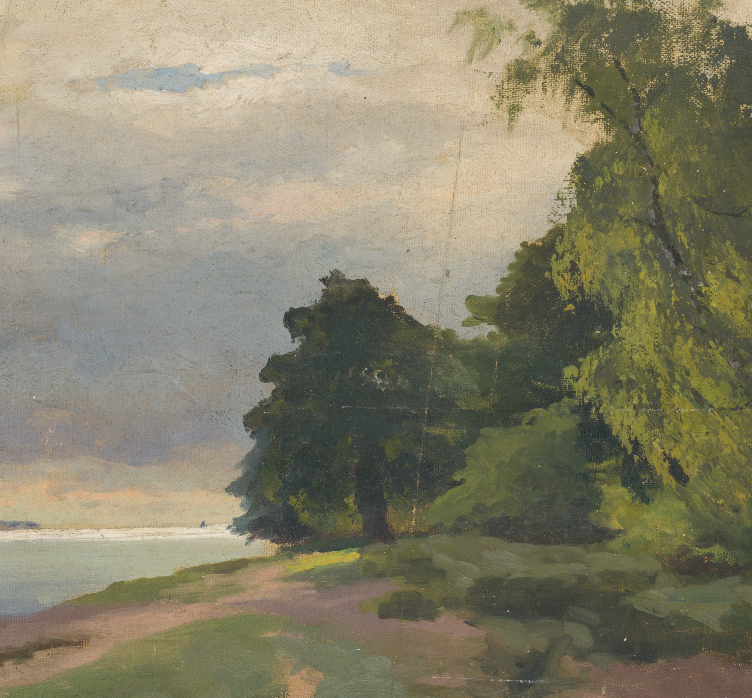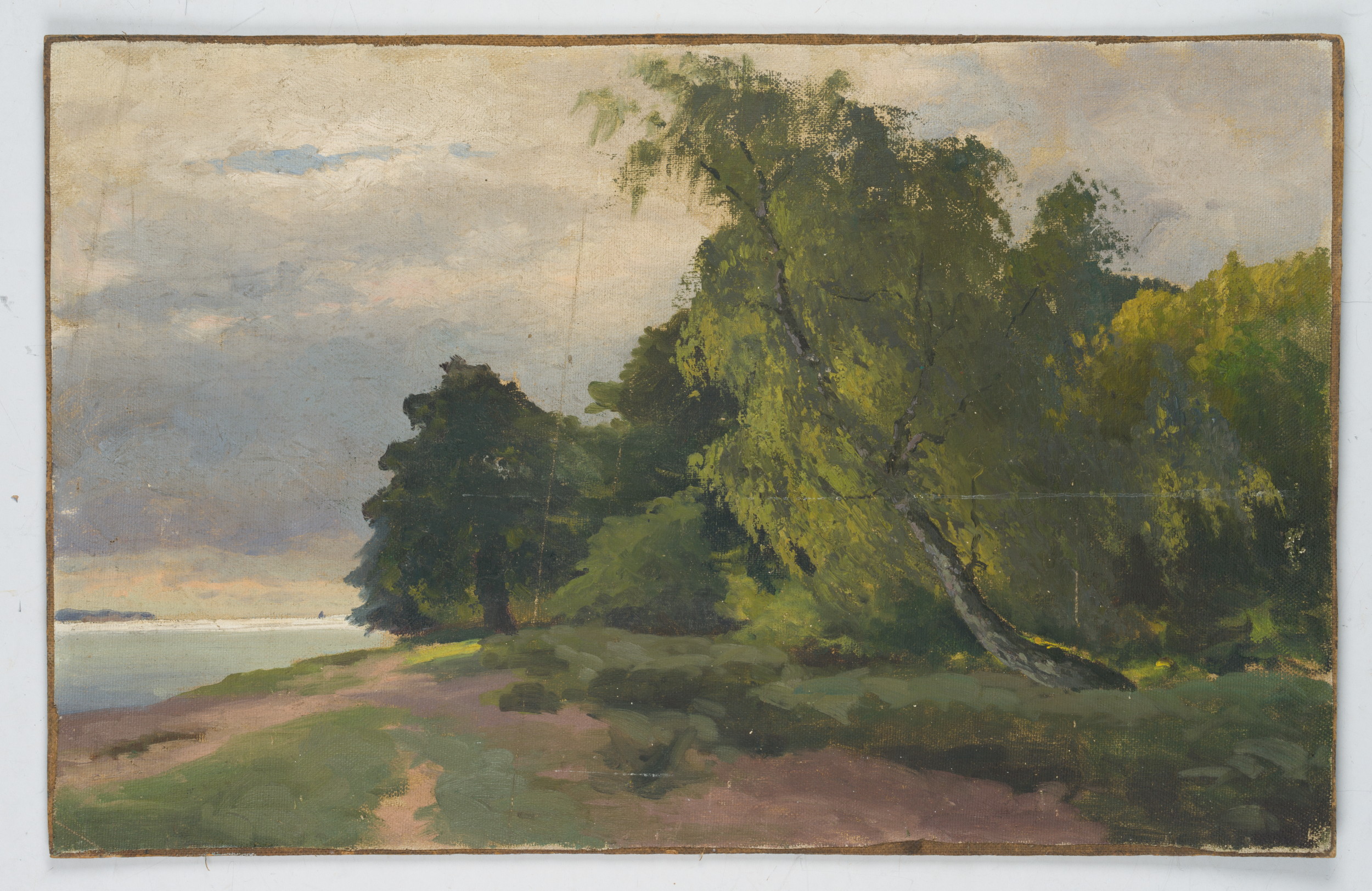 Olga Potthast von Minden (1869 Sanderbusch – 1942 Varel), Uferlandschaft mit Wald, um 1905, Öl