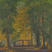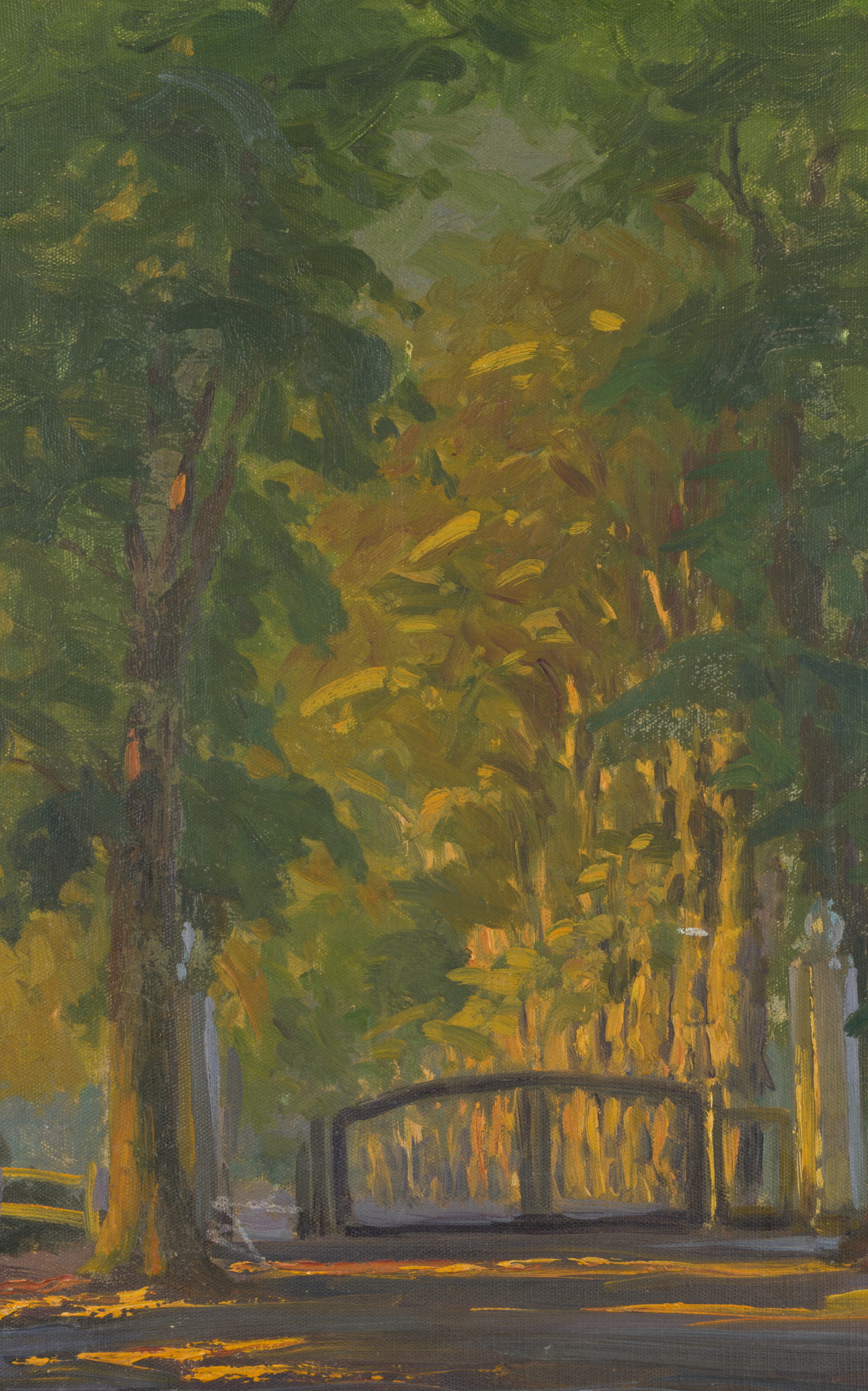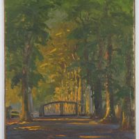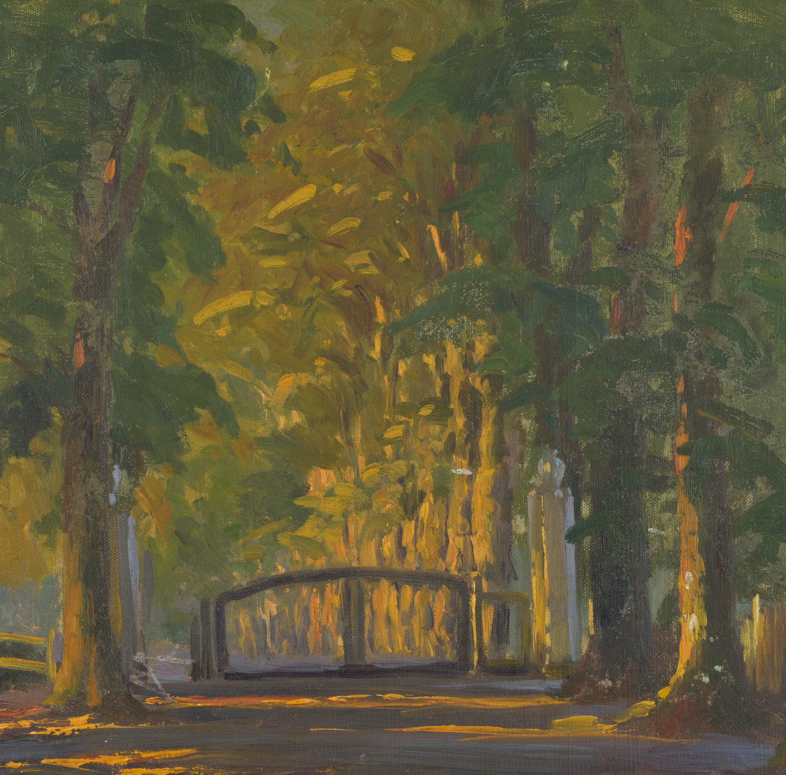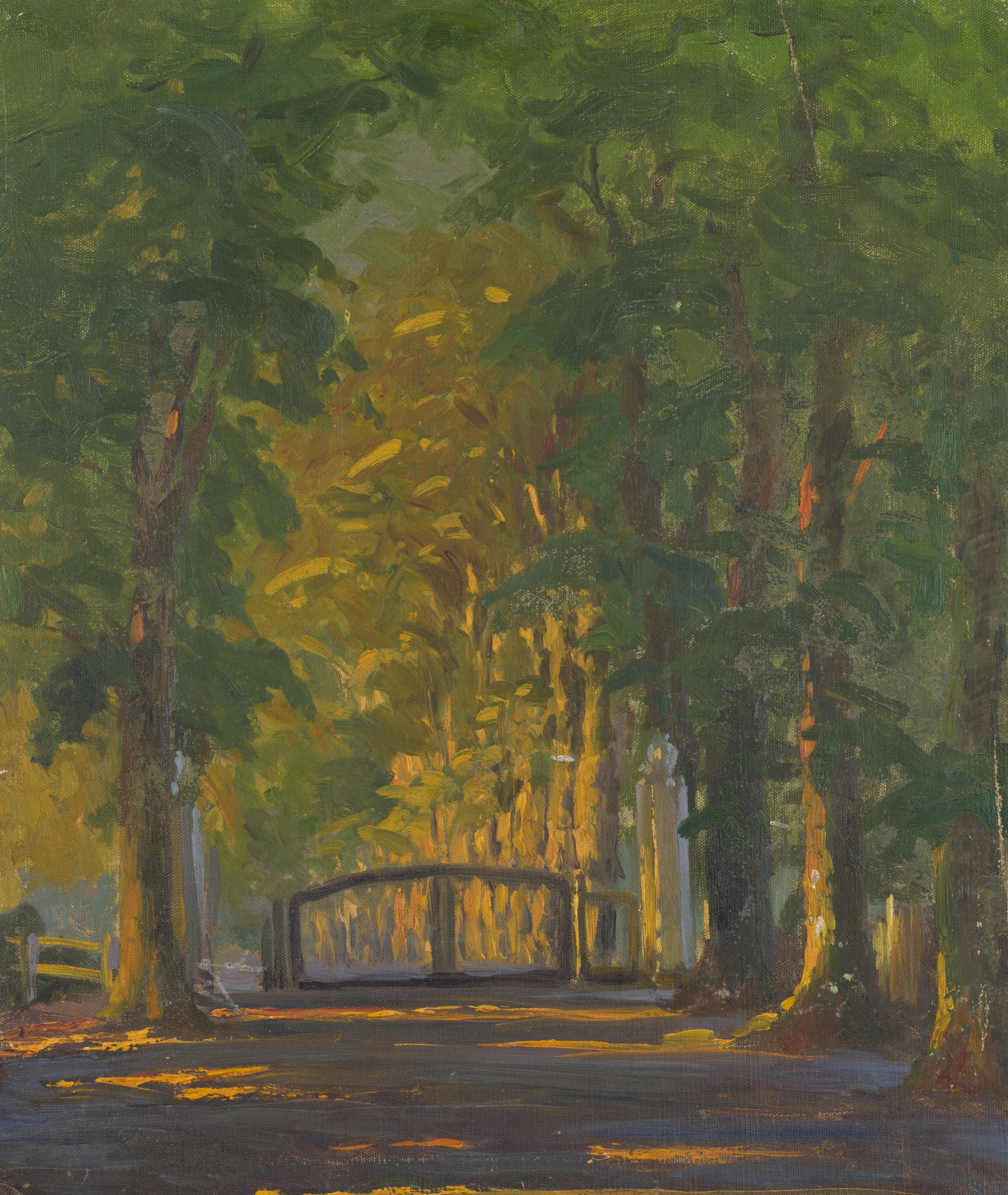 Olga Potthast von Minden (1869 Sanderbusch – 1942 Varel), Waldstraße auf ein verschlossenes Tor zuführend, , Öl