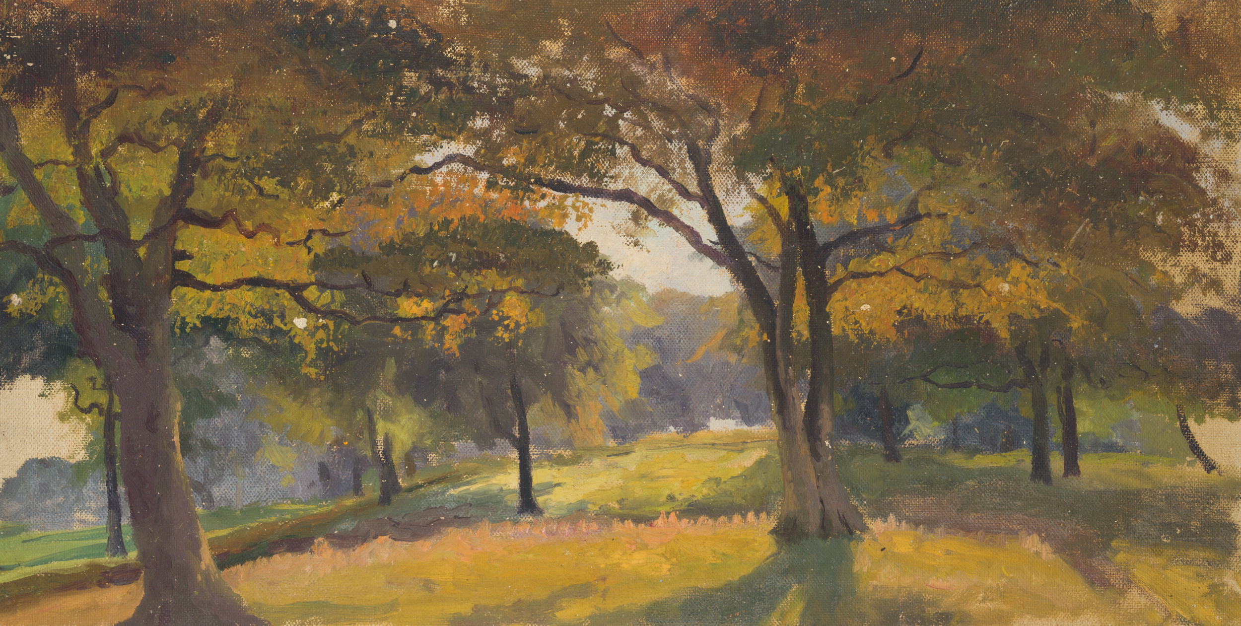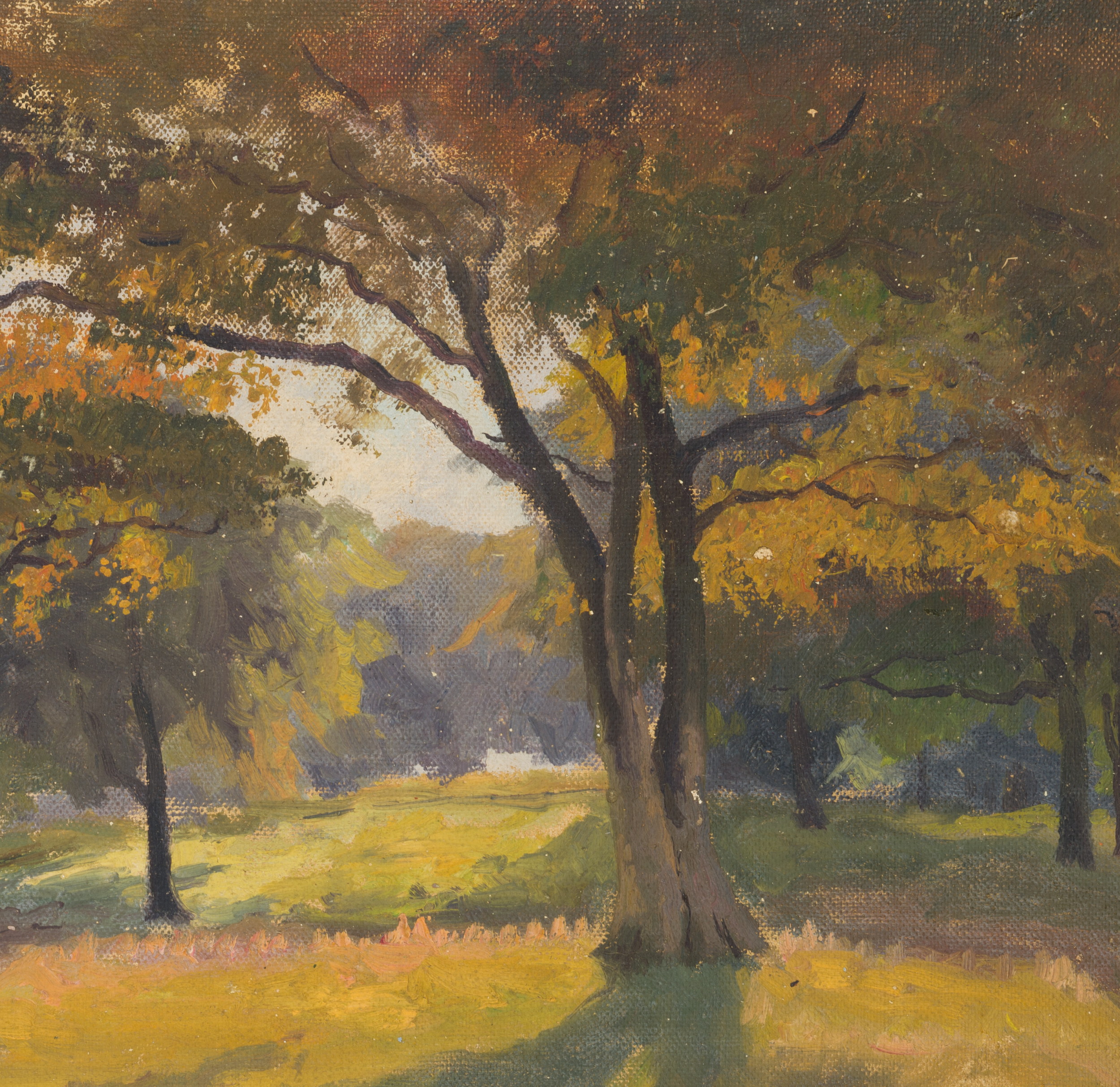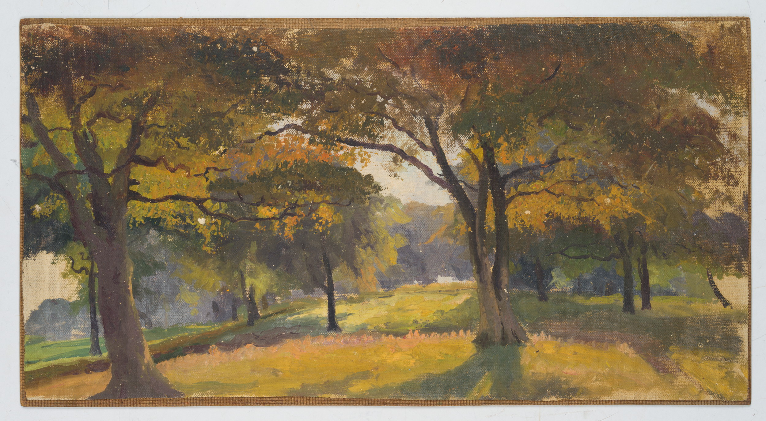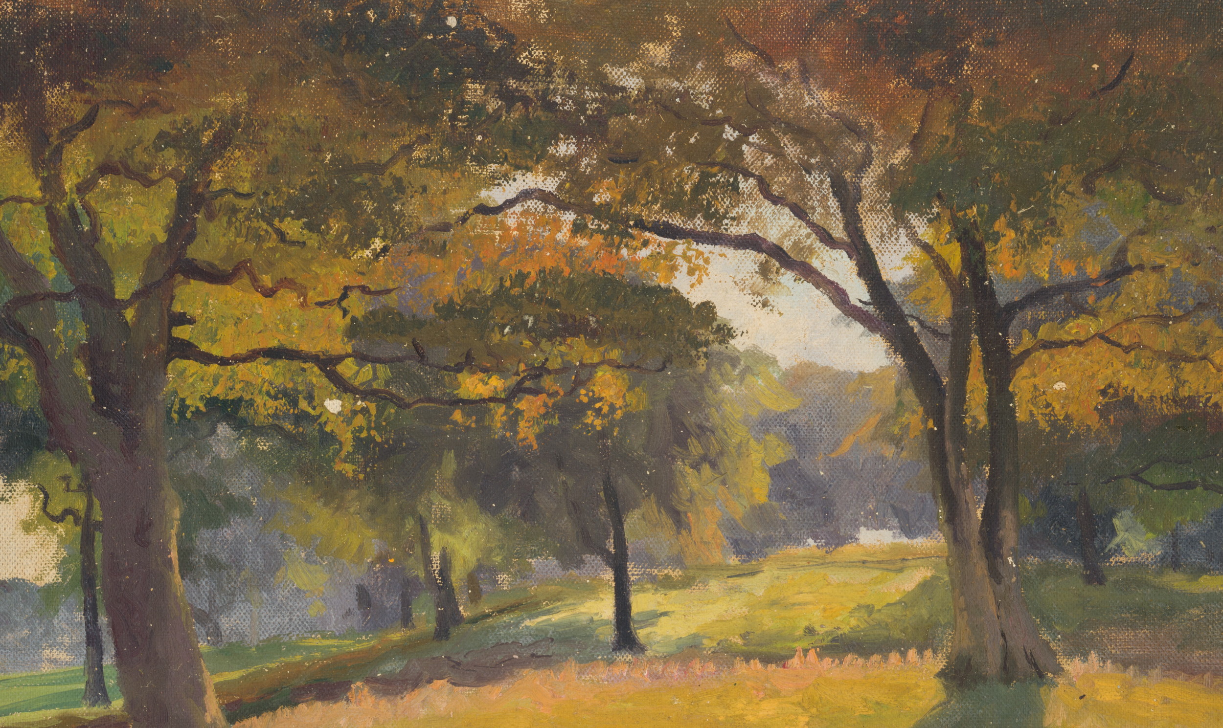 Olga Potthast von Minden (1869 Sanderbusch – 1942 Varel), Wiese mit Bäumen zum Herbstbeginn, um 1910, Öl