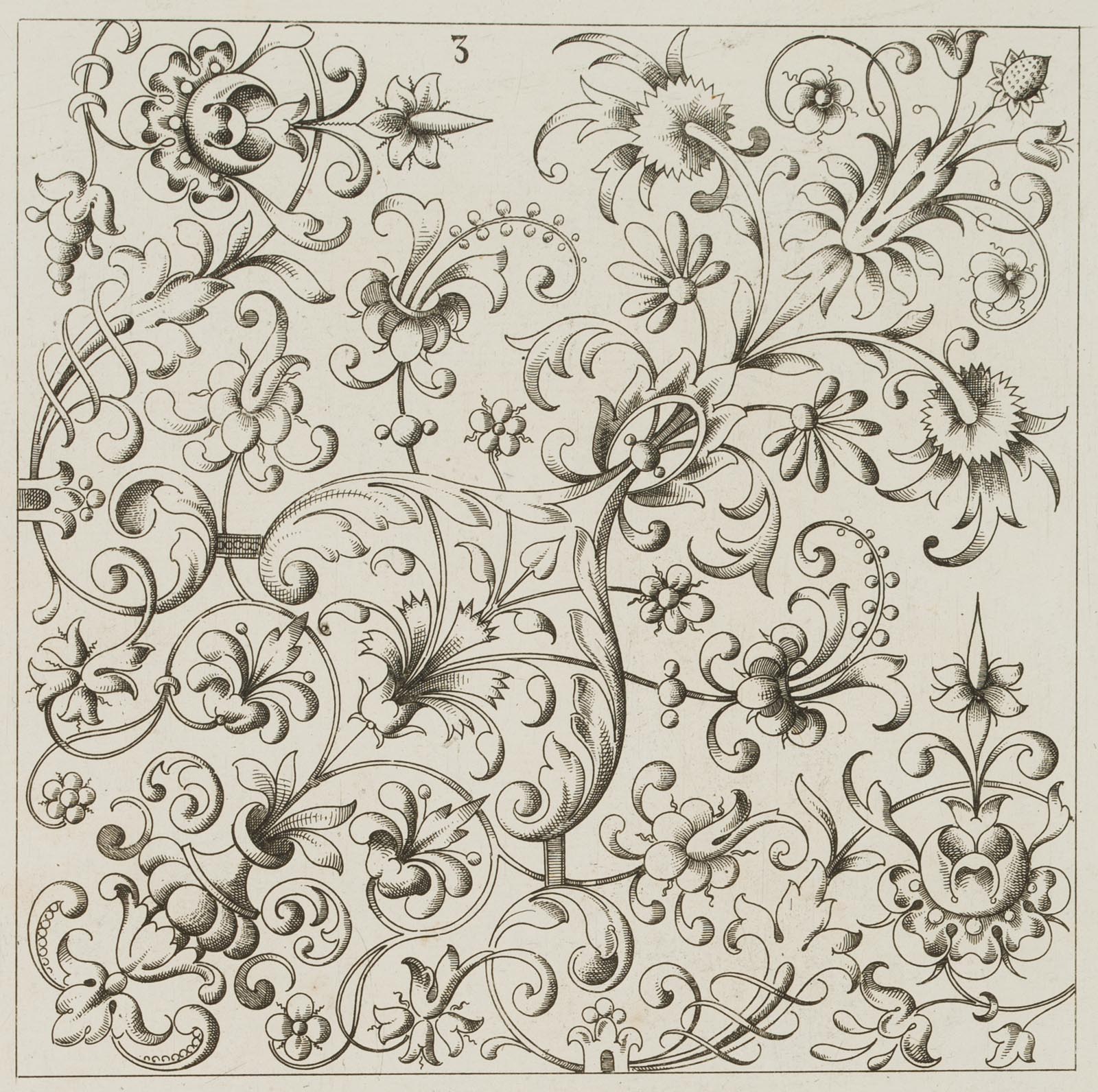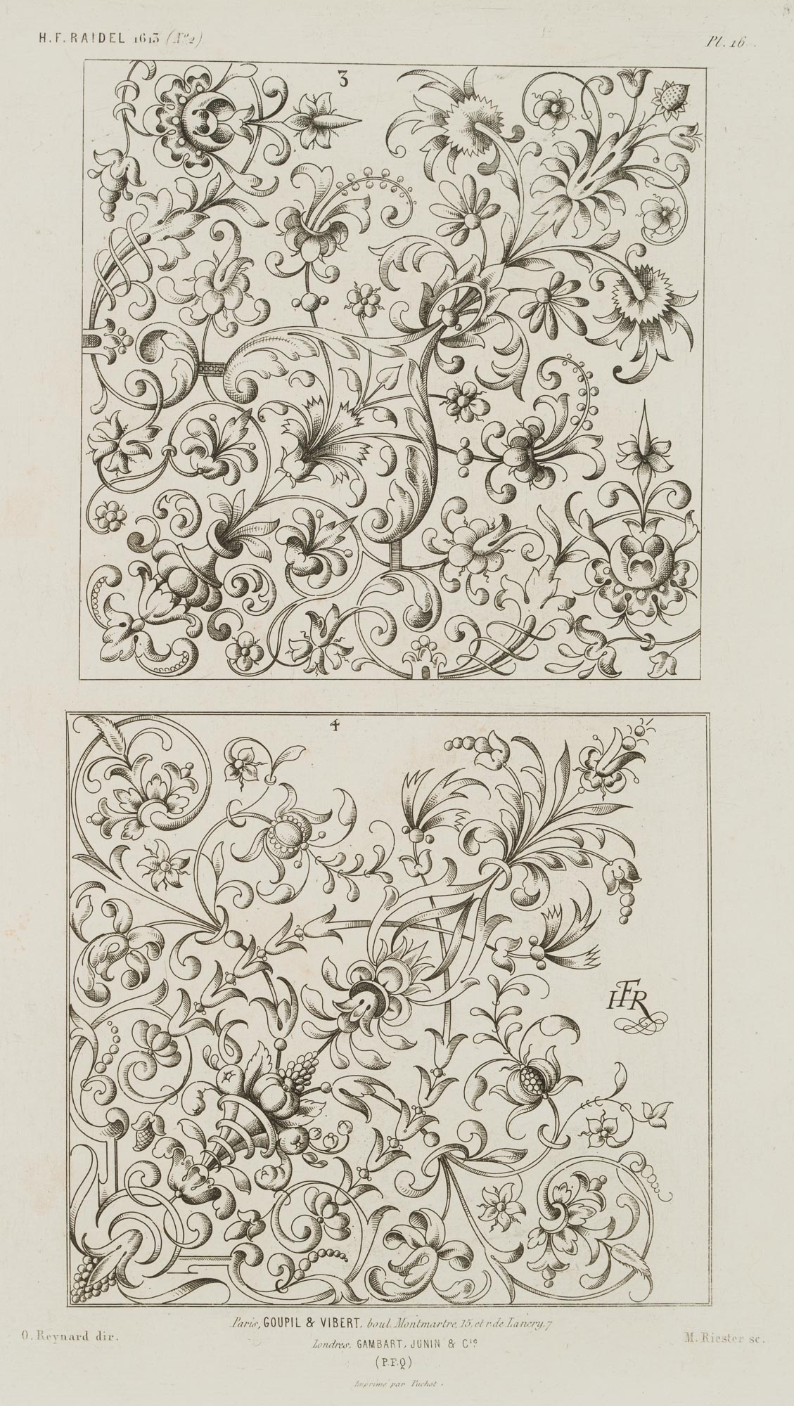 Ovide Reynard (born 1817 Auvergne), Pattern Floral tendril ornaments, after H F RAIDEL of 1613, sheet no 2, plate 16, 19th century, Etching