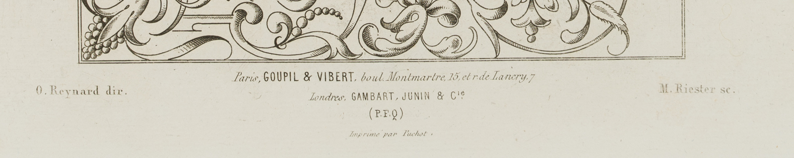 - Bezeichnung: Links unterhalb der Darstellungen signiert mit “O. Reynard dir.” und rechts mit “M. Riester sc.” und rechts unten nummeriert mit “Pl. 20”. Mittig darunter mit Angaben zum Herausgeber: “Paris Goupil & Vibert”. Unten rechts mit einem Wasserzeichen aus geschwungenen Linien.
