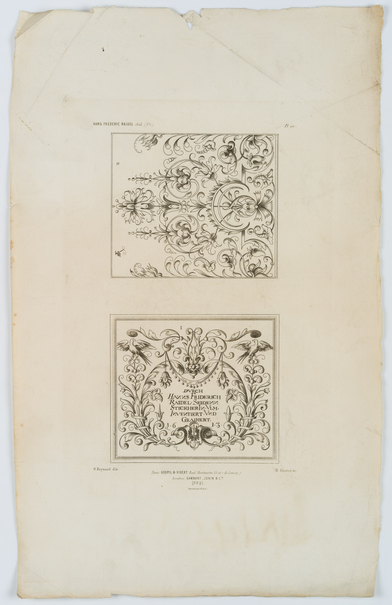 Ovide Reynard (born 1817 Auvergne), 2 pattern templates Floral tendril ornaments, after Hans Friedrich RAIDEL of 1613, sheet no 1, plate 10, 19th century, Reproduction