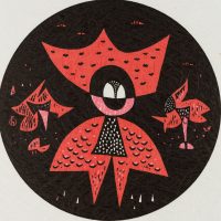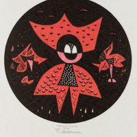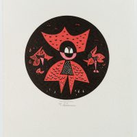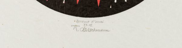 - Description: Abstract fantastic creatures in red colour float around in a black circle. The red figure in the middle is reminiscent of a little devil. Their large white eyes shine eerily from the black surface of the circle. Inscribed, numbered and illegibly signed in the centre below the print: “épreuve d’essay | 77.15. | K Oberbeckamnn [?] “.