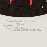 - Beschreibung: In einem schwarzen Kreis schweben abstrakte phantastische Wesen in roter Farbe umher. Die rote Gestalt in der Mitte erinnert an ein Teufelchen. Ihre großen weißen Augen leuchten unheimlich aus der schwarzen Fläche des Kreises. Mittig unterhalb des Druckes beschriftet, nummeriert und unkenntlich signiert mit: “épreuve d’essay | 77.15. | K Oberbeckamnn [?] “.