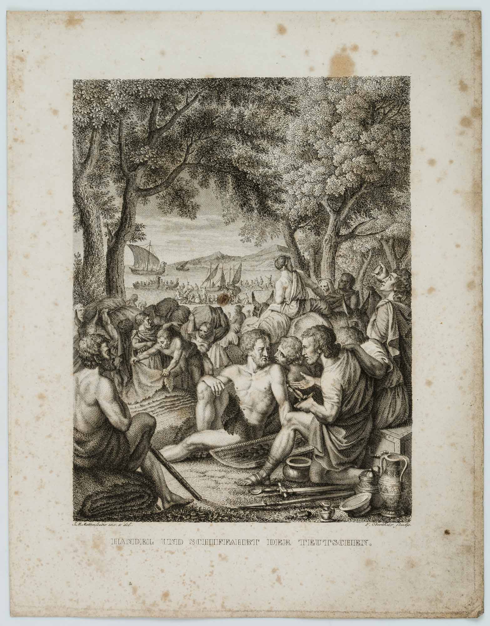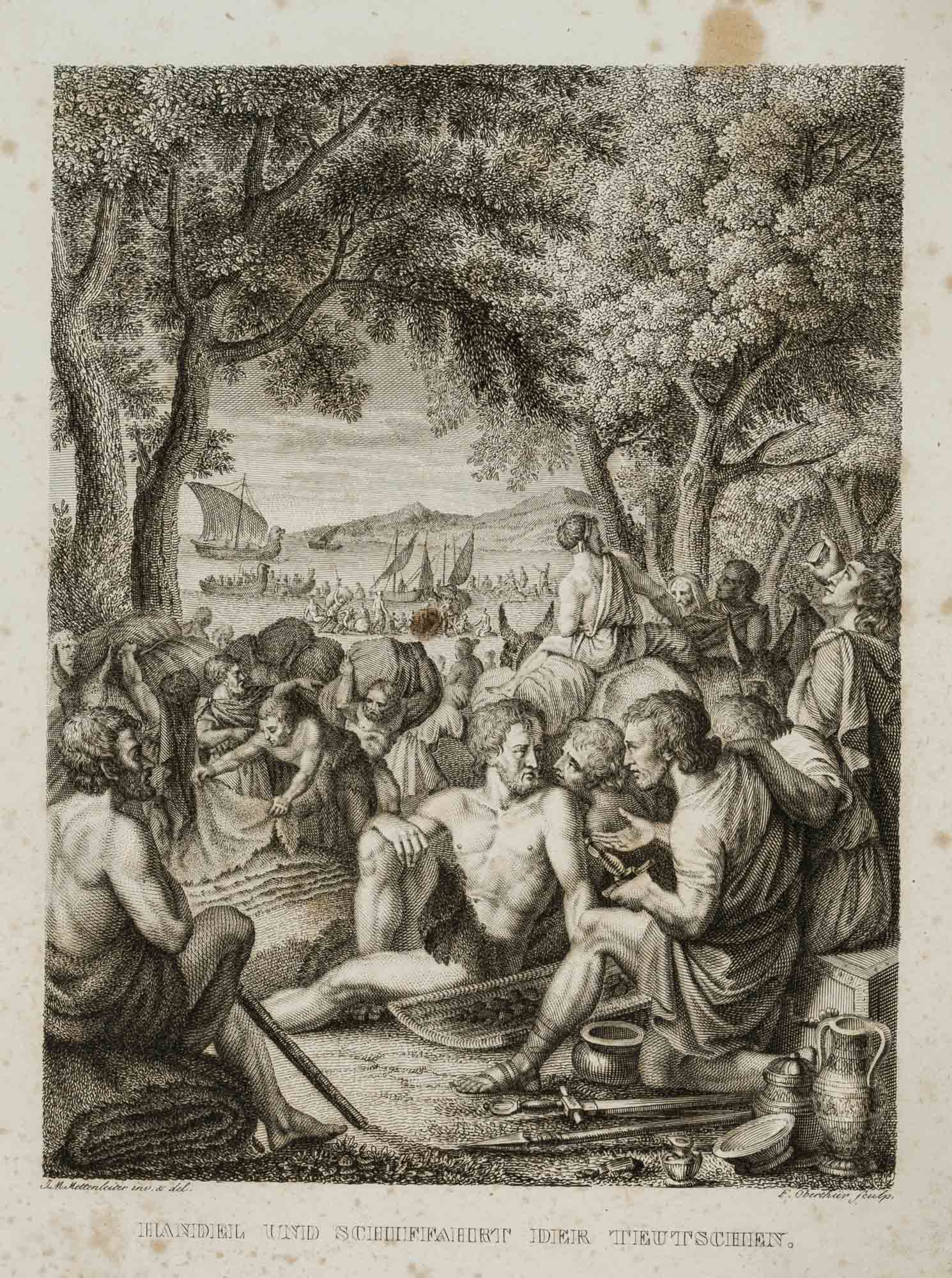 François Jacques Oberthür (1793 Straßburg – 1863 Bischweiler) nach Johann Michael Mettenleiter (1765 Großkuchen – 1853 Passau), “Handel und Schiffahrt der Teutschen”, Germanen, Buchillustration, 1823, Kupferstich