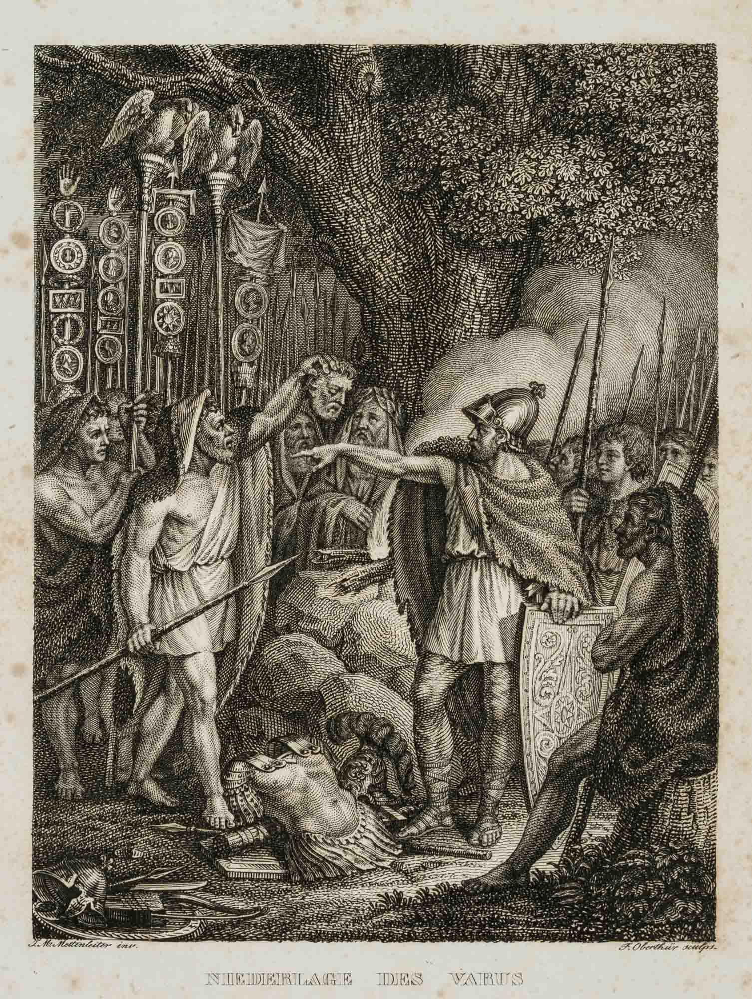 - Beschreibung: Varusschlacht, September 9 n. Chr. Die Cherusker unter Arminius (Hermann) schlagen die 17.-19. röm. Legion unter Varus im Teutoburger Wald. Kupferstich nach Johann Michael METTENLEITER. Aus: Alois Schreiber, Teutschland und die Teutschen, Karlsruhe 1823.