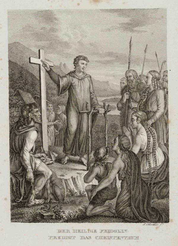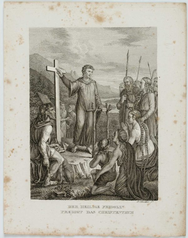 François Jacques Oberthür (1793 Strasbourg – 1863 Bischweiler) after Johann Michael Mettenleiter (1765 Großkuchen – 1853 Passau), „Saint Fridolin preaches Christianity“, Germanic, missionary, 1823, Copper engraving