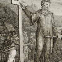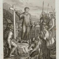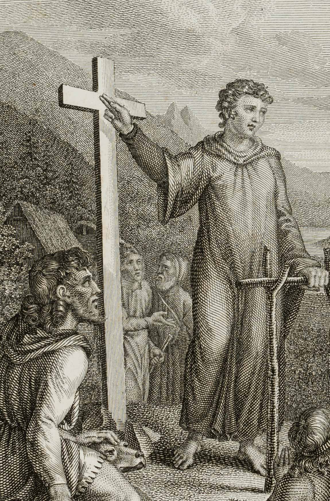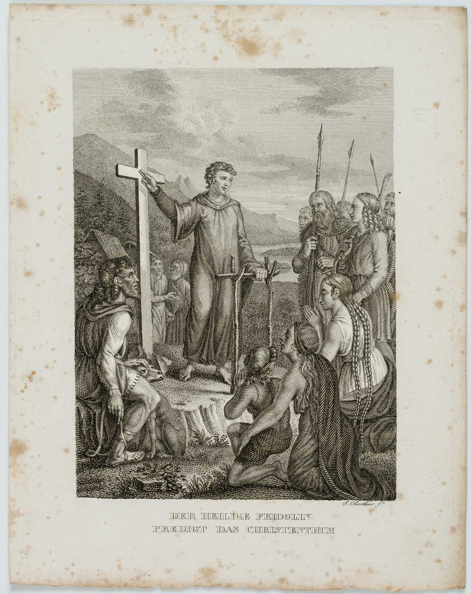 François Jacques Oberthür (1793 Straßburg – 1863 Bischweiler) nach Johann Michael Mettenleiter (1765 Großkuchen – 1853 Passau), „Der Heilige Fridolin predigt das Christentum“, Germanen, Missionar, 1823, Kupferstich
