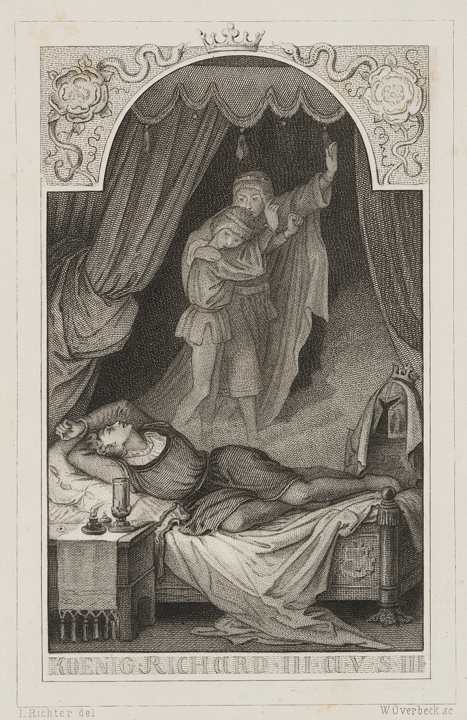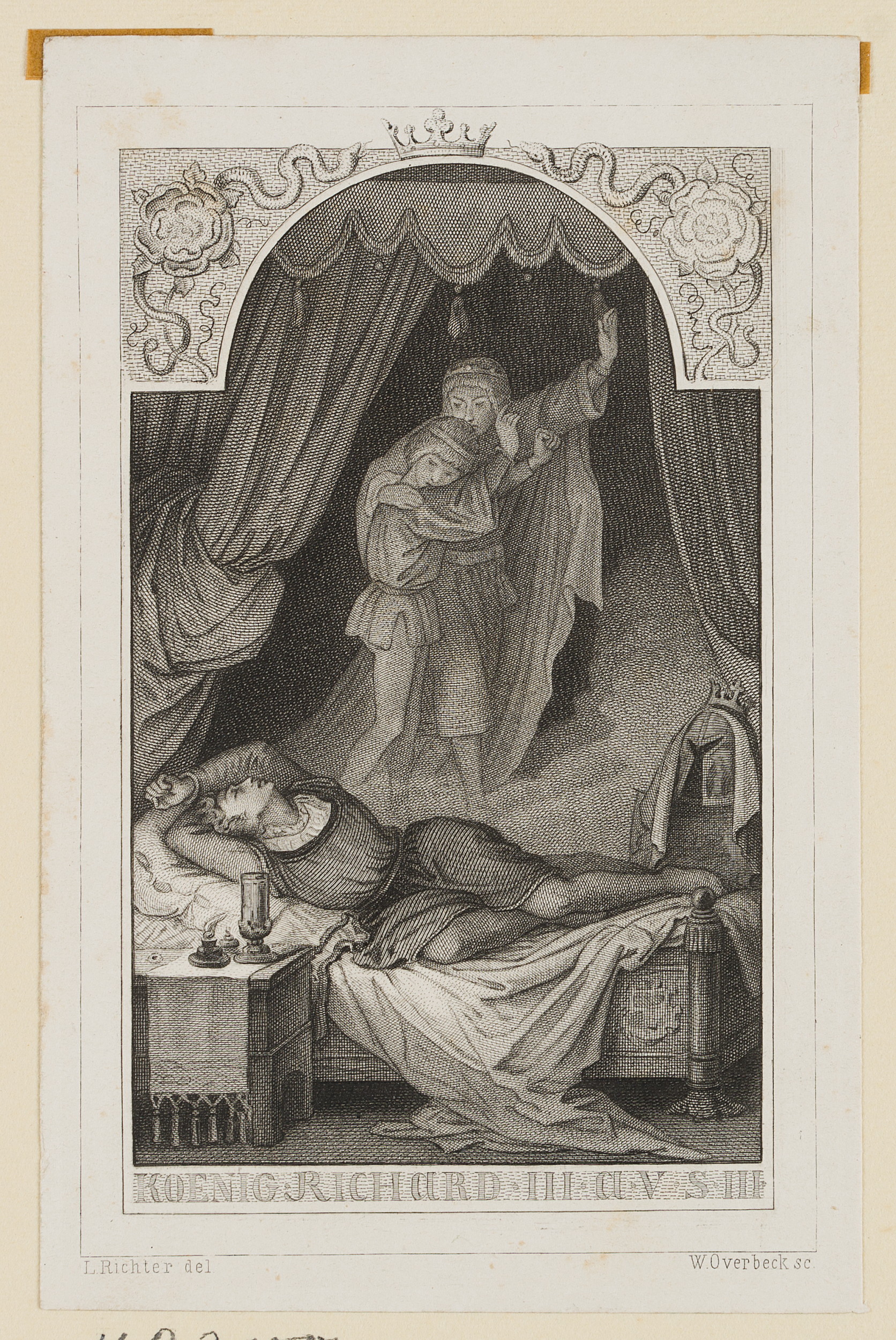 - Bezeichnung: Unten im Druck signiert: “L. Richter del. / W. Overbeck sc.”. Unten im Druck bezeichnet: “Koenig Richard III A V S III”.