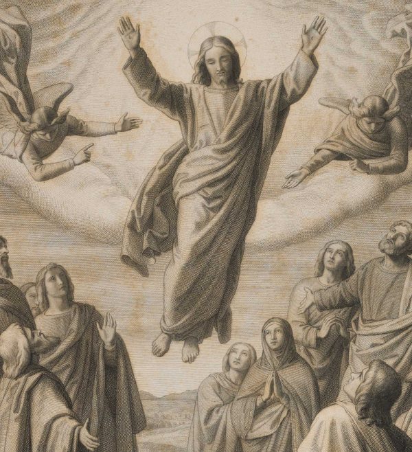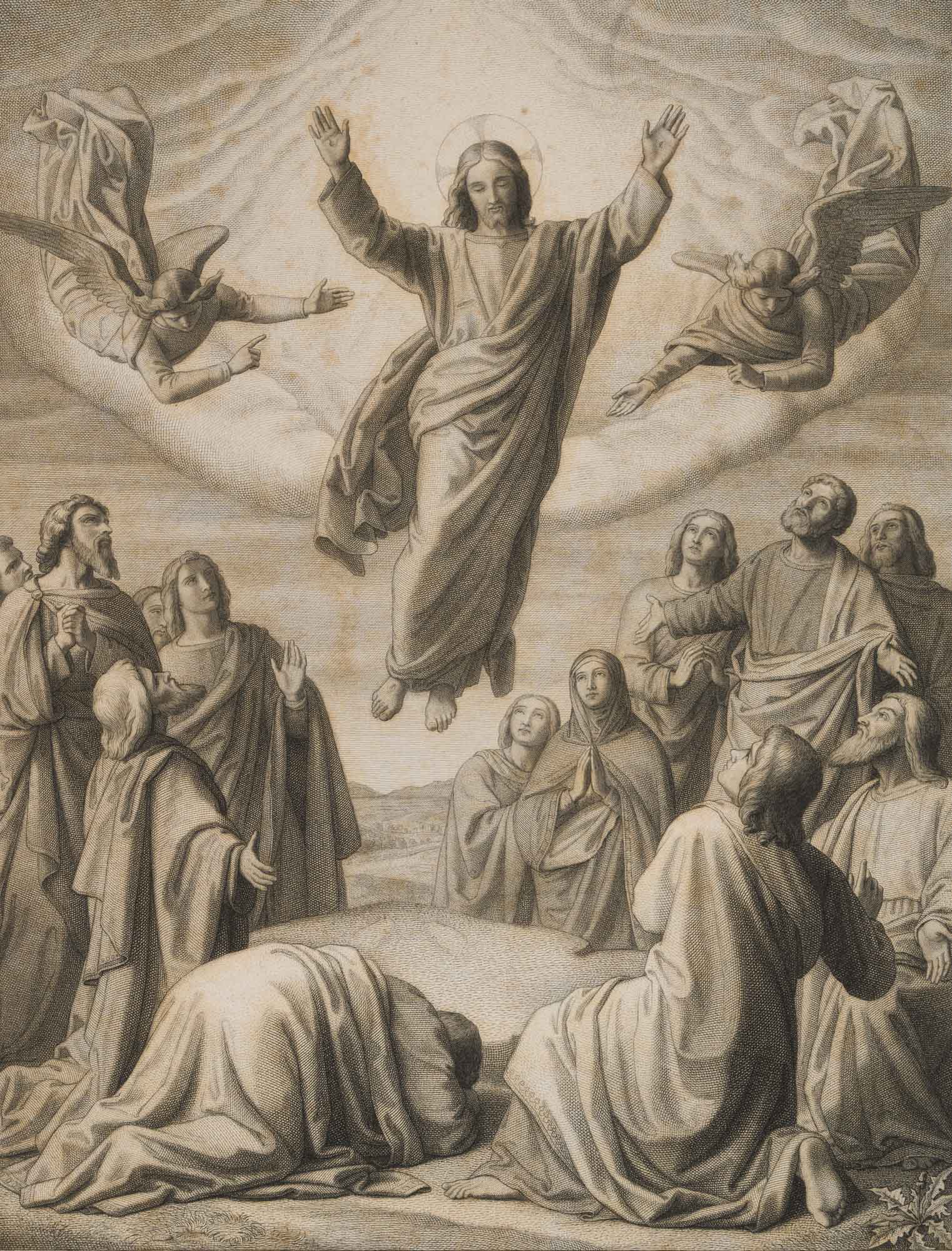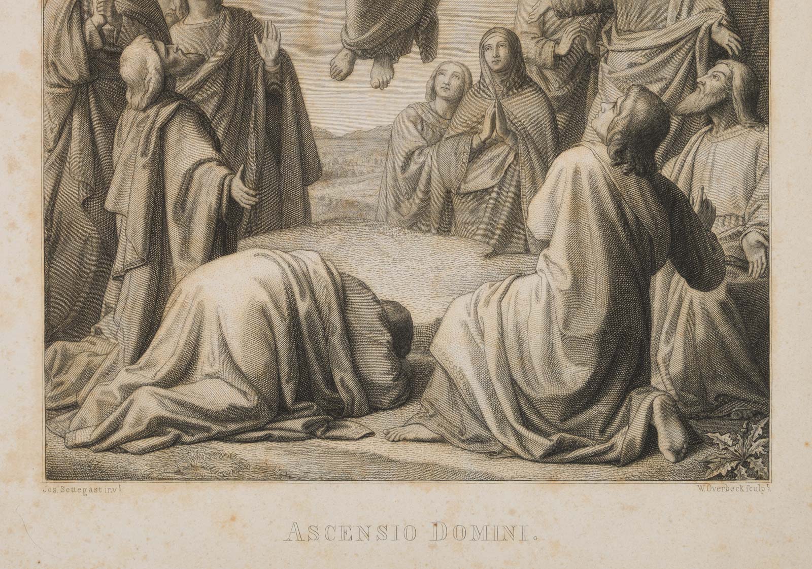 - Description: The miracle depiction Ascensio Domini in the style of the Nazarenes takes up the compositional structure of Raphael’s Transfiguration in large parts. In Overbeck’s work, too, the floating Christ is flanked by two angels, he has his arms outstretched, and at his feet on the ground are the followers of Jesus.