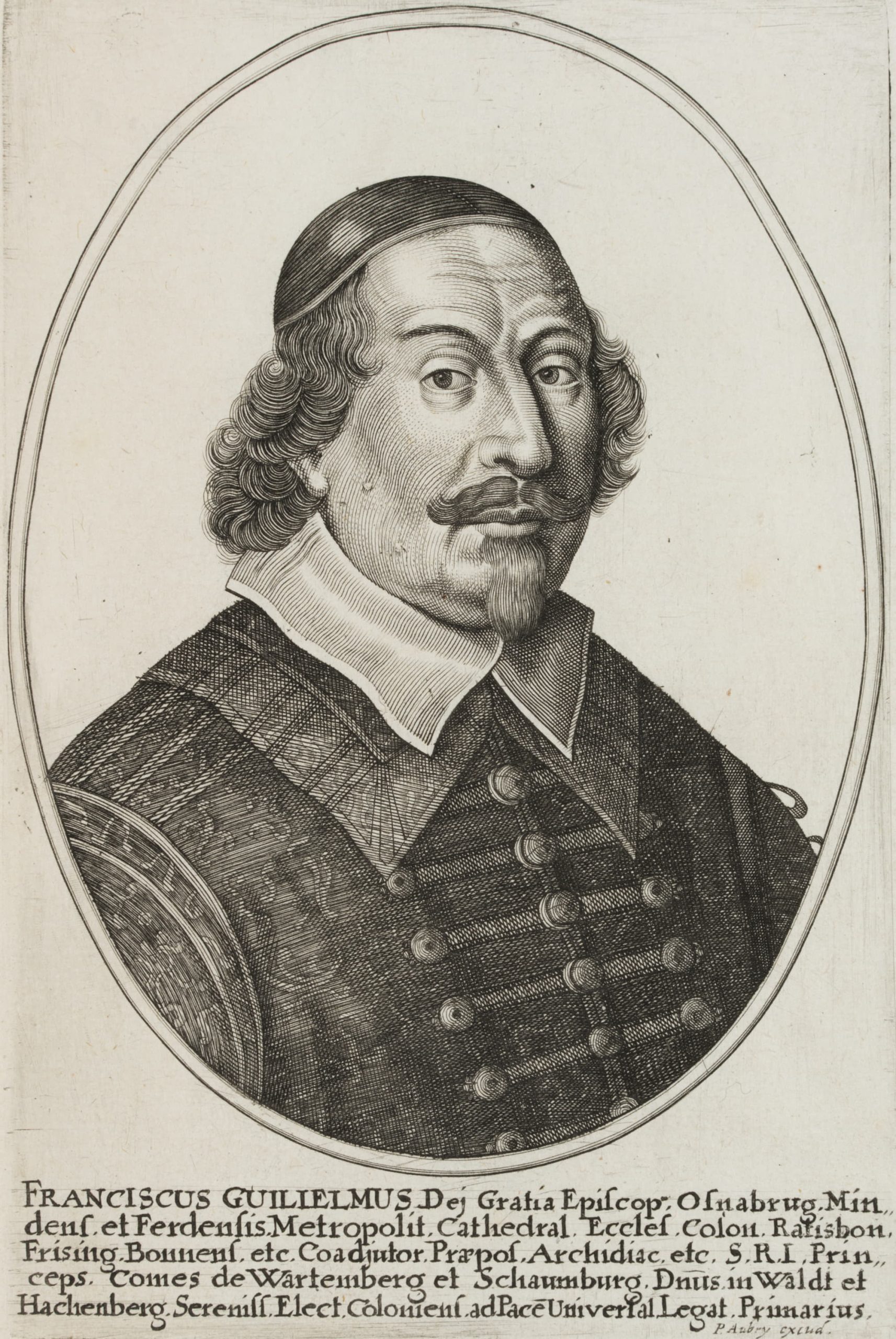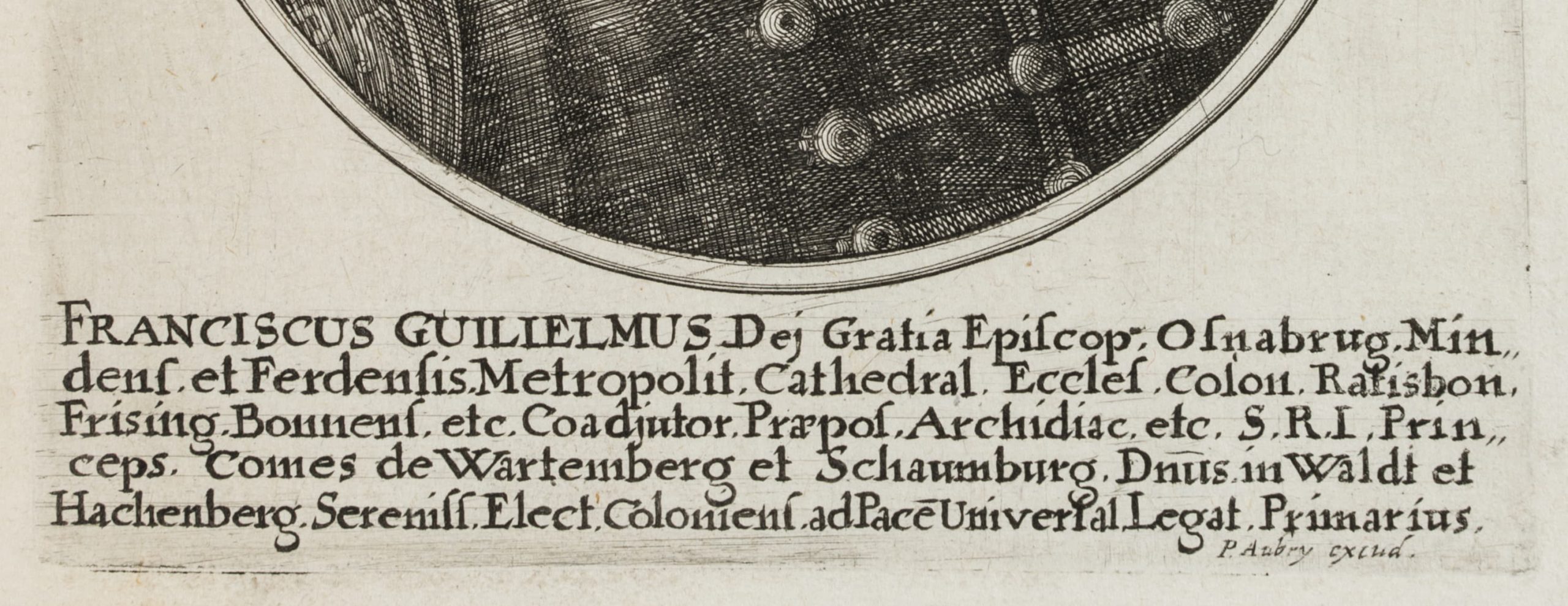 • Bezeichnung: Unterhalb der Darstellung in der Druckplatte bezeichnet und signiert: “FRANCISCUS GUILIELMUS Dej Gratia Episcop [..] | P. Aubry excud.”