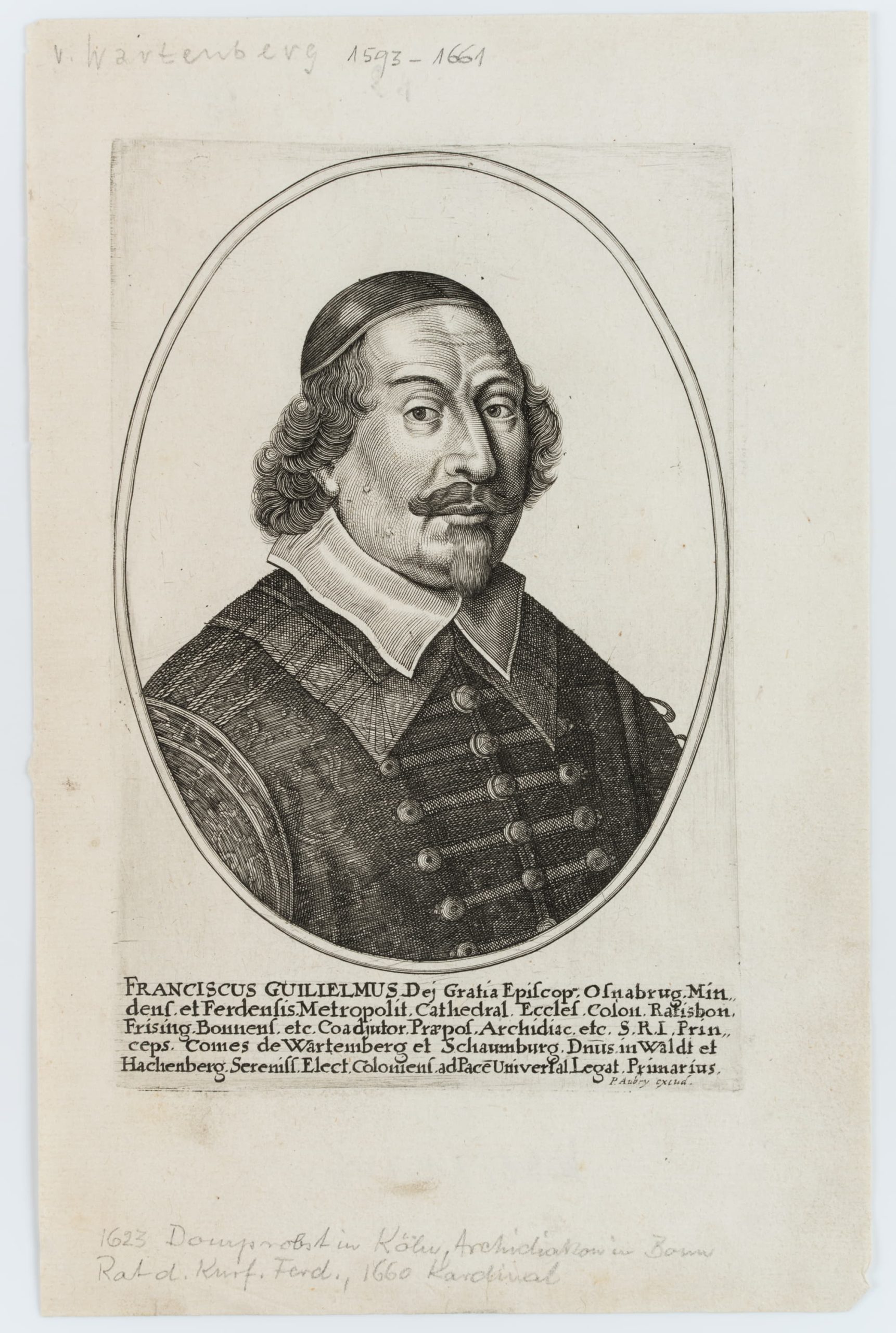 • Description: Half-length portrait in three-quarter profile to the right in an oval frame of Franz Wilhelm Cardinal Reichsgraf von Wartenberg, Prince-Bishop of Osnabrück and Regensburg and Prime Minister of the Electorate of Cologne with pileolus and embroidered doublet with white shirt collar above.