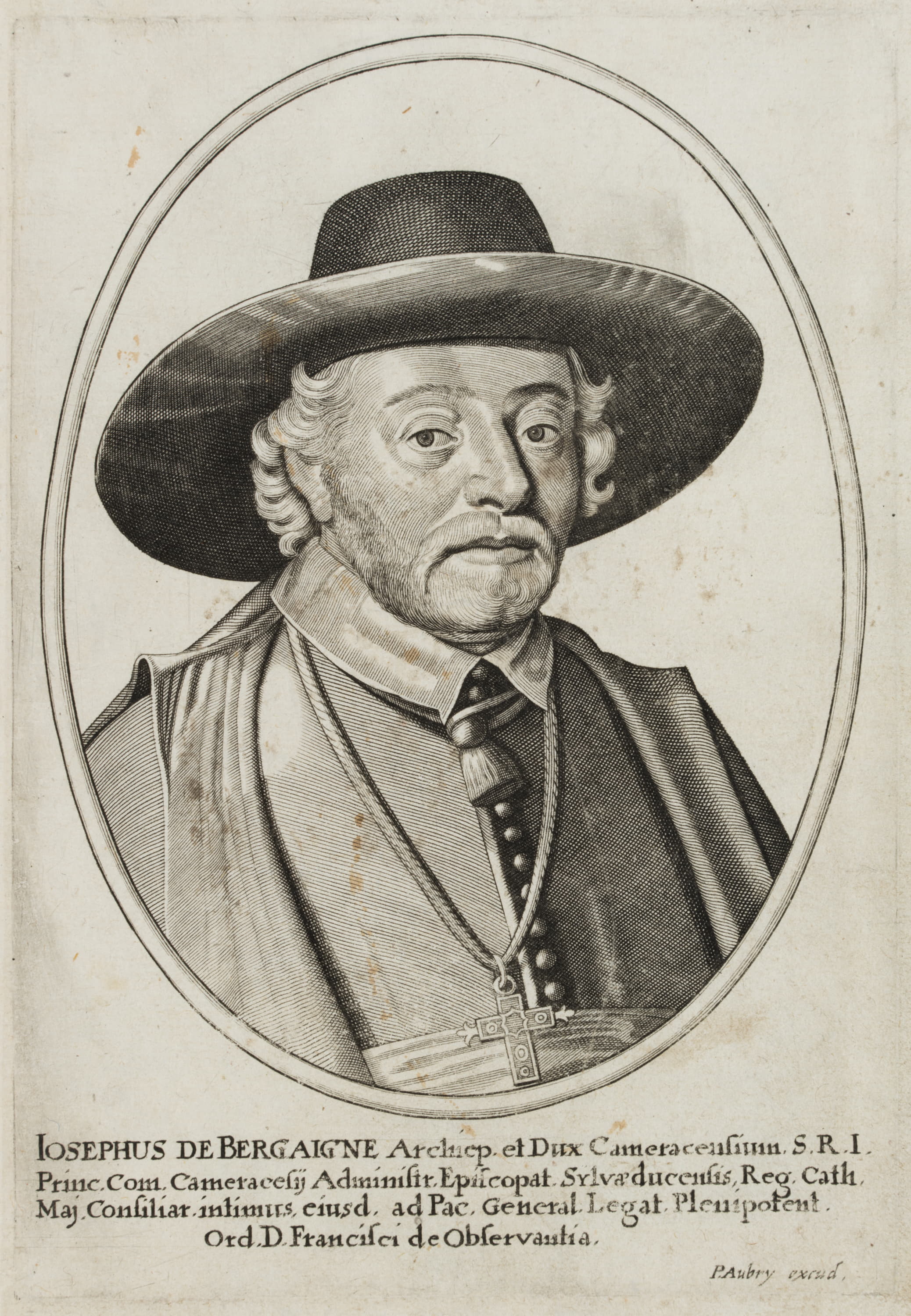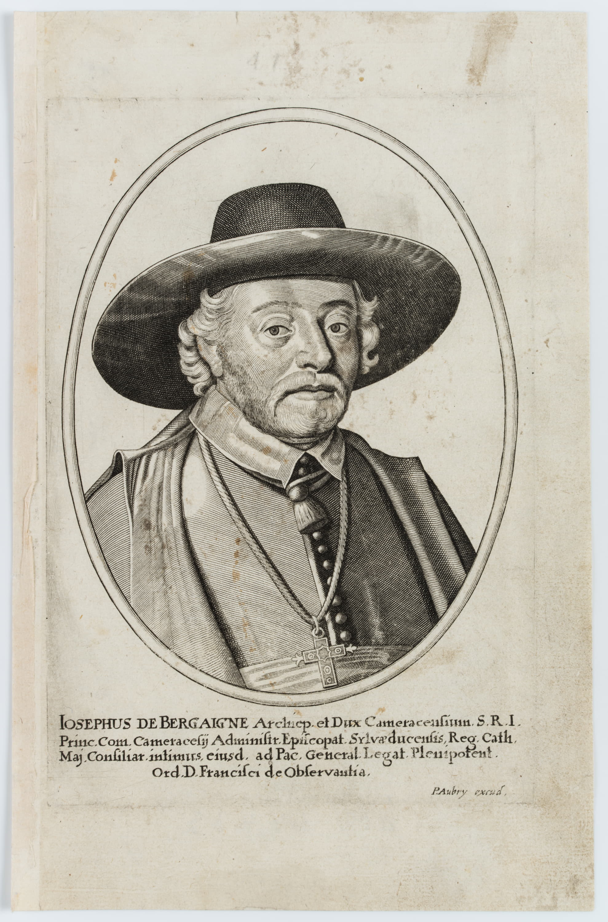 - Description: Bust portrait of the Archbishop and Spanish envoy to the Peace of Westphalia in Münster Joseph Bergaigne in oval frame to the right with hat. Peter Aubry made the portrait after Paulus Pontius’ model, who engraved the picture after an unknown painting by Anselmus Van Hebbelynck Hulle.
