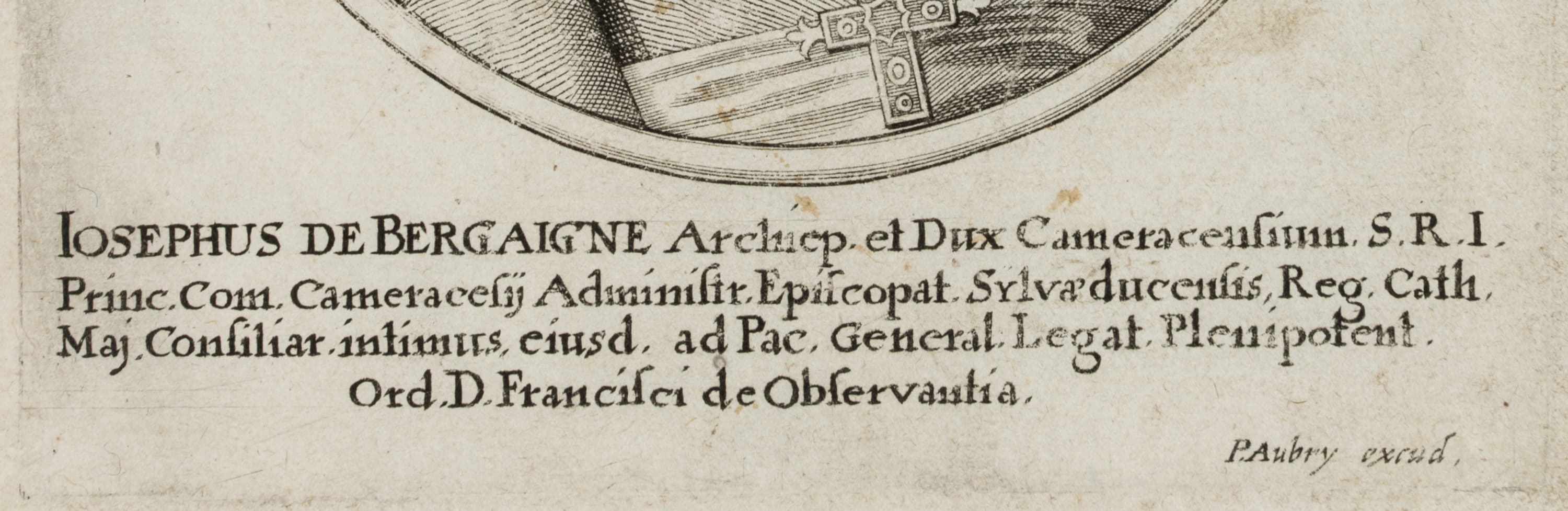- Inscription: Inscribed below the image in the printing plate “IOSEPHUS DE BERGAIGNE Archiep. et Dux Cameracensium [..]” and signed “P.Aubry excud.”.