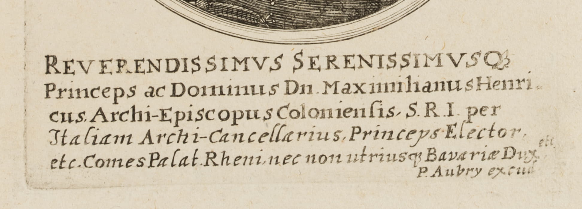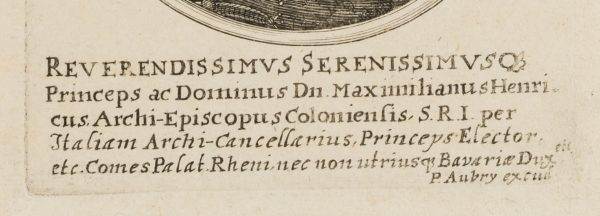 - Inscription: Inscribed and signed below the image in the printing plate: “REVERENDISSIMVS SERENISSIMVSQ [..] | P. Aubry excud.”