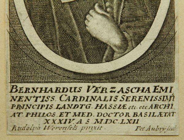 - Bezeichnung: Unterhalb der Darstellung mit dem latinisierten Namen und der Profession des Dargestellten bezeichnet sowie auf 1662 datiert. Darunter in der Druckplatte vom Künstler signiert.