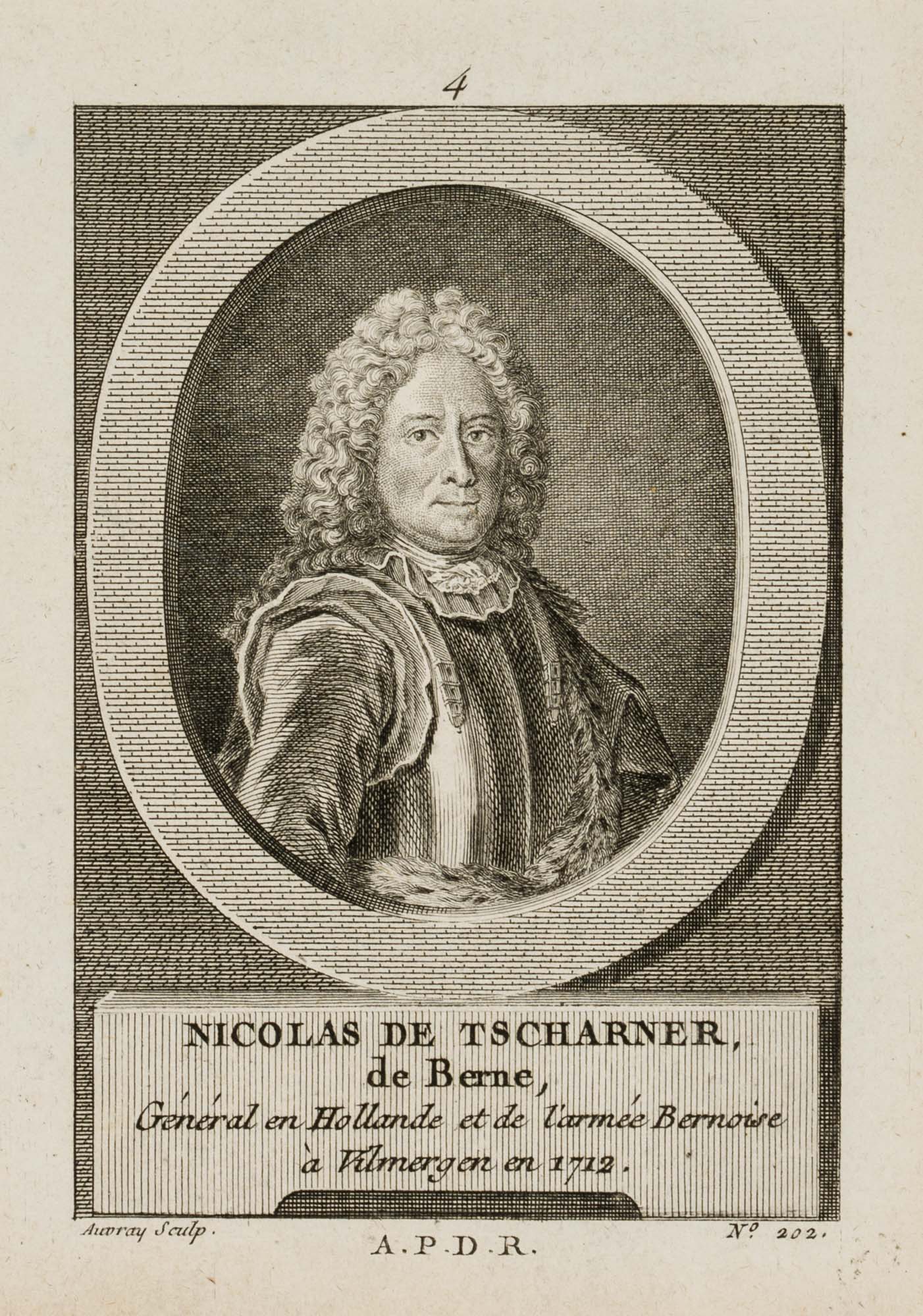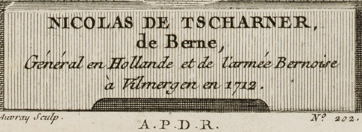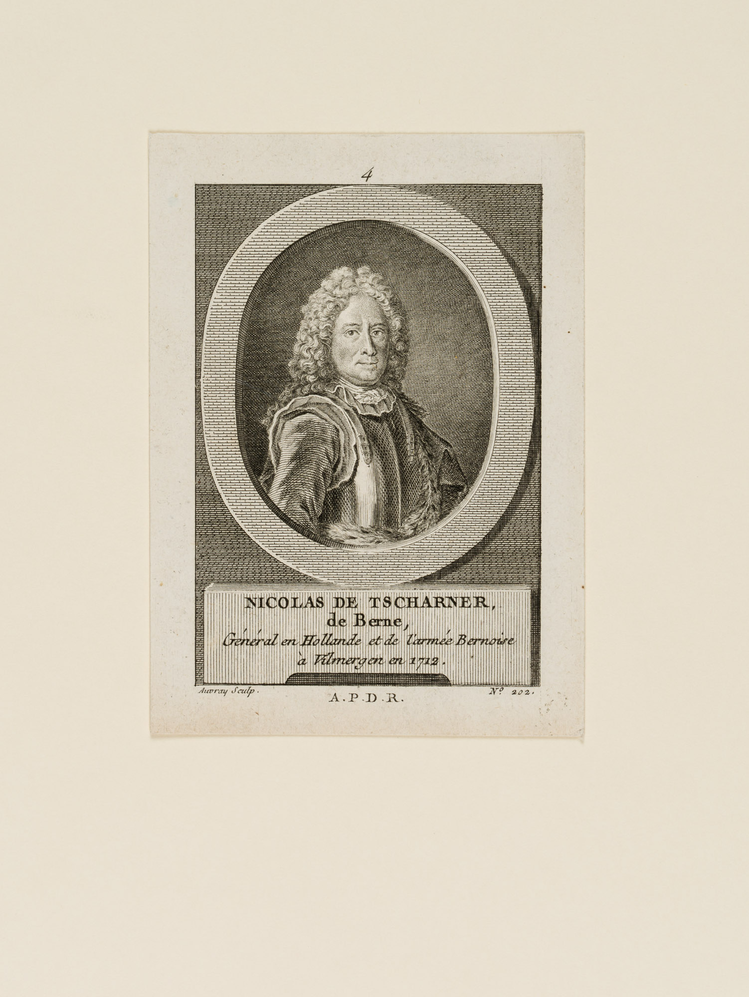 • Inscription: Inscribed below the image within the printing plate: “Auvray sculp. / A. P. D. R. / No. 202.” and titled and inscribed within the image with details of the sitter: “‘Nicolas de Tscharner, de Berne, Général en Hollande et de l’armée Bernoise à Vilmergen en 1712.’ Numbered above the image: “4”.