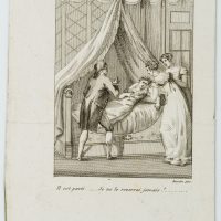 - Description: Two ladies dressed in the fashion of the Empire and a gentleman in a frock coat care for the lovesick woman lying in bed.