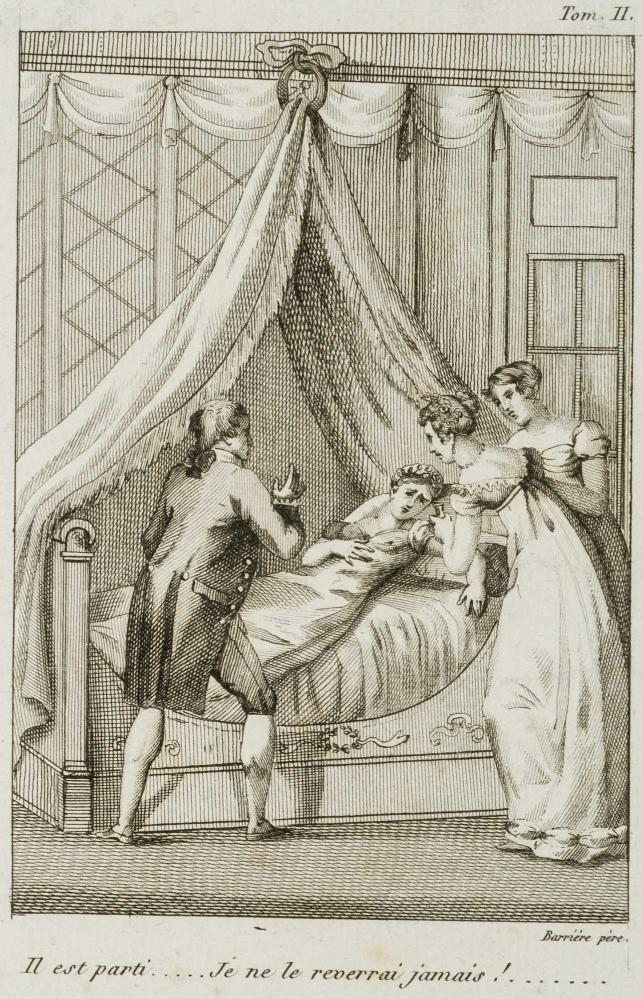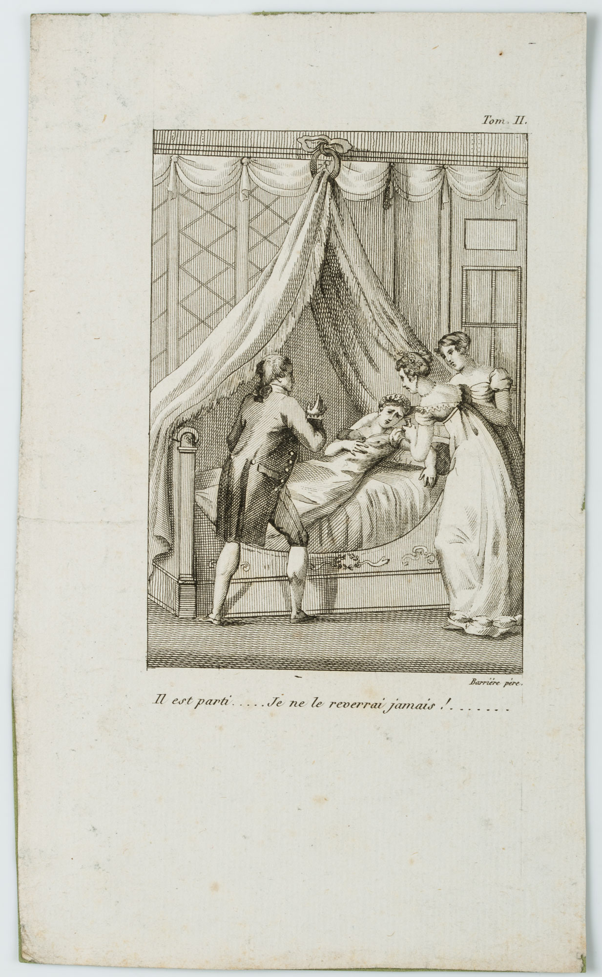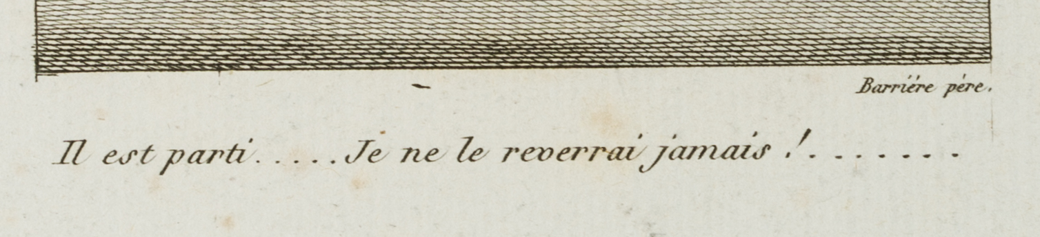 - Bezeichnung: Rechts unter der Graphik signiert mit: “Barrière pére”. Darunter die Bildunterschrift: “Il est parti … Je ne le reverrai jamais! …” Oben rechts nummeriert mit: “Tom. II.”