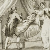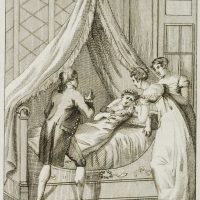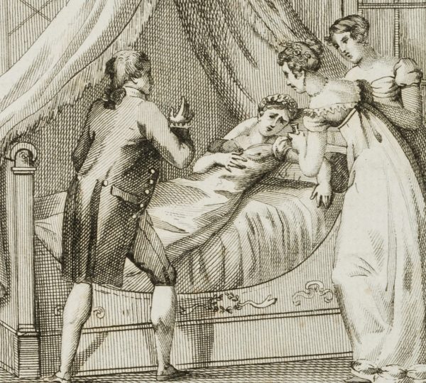 - Beschreibung: Zwei Damen gekleidet in der Mode der Empire und ein Herr in Gehrock sorgen sich um die im Bett liegende Liebeskranke.